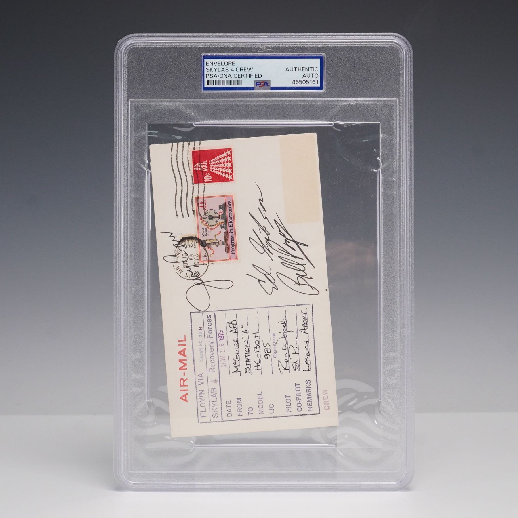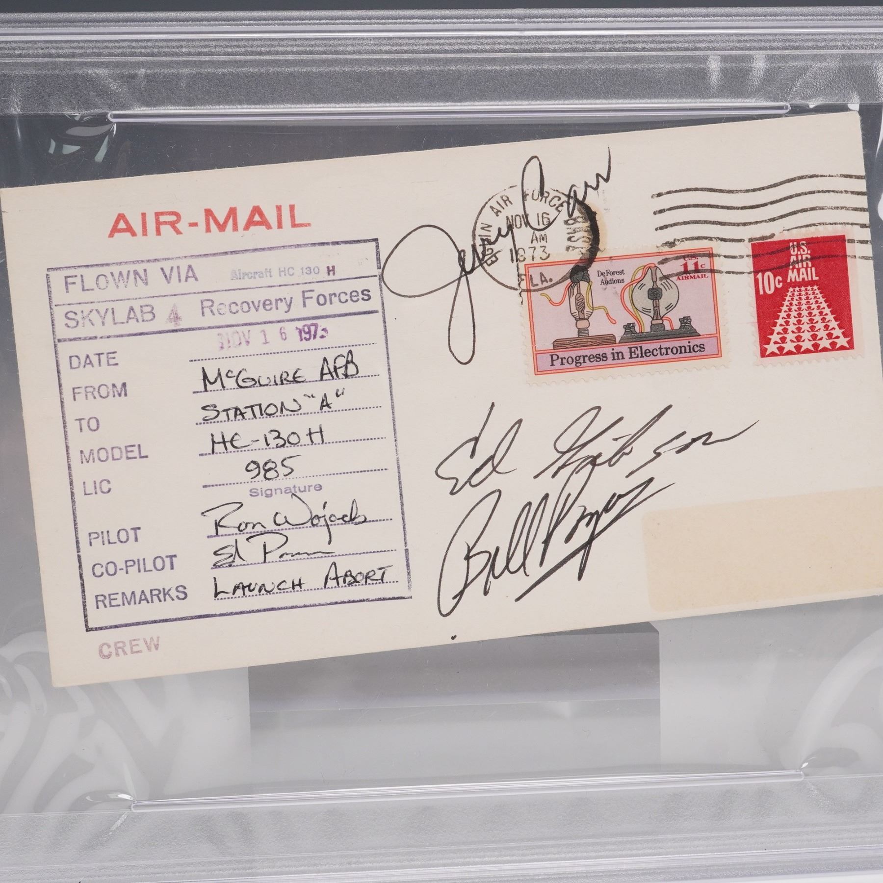 Up for sale is a NASA Skylab 4 Recovery Force Launch Abort Cover, hand-signed by all three Skylab 4 crew members: Gerald P. Carr, Edward Gibson, and William (Bill) Pogue, as well as Ron Wojcik and Ed Parr. This Air-Mail flown cover is a rare piece of NASA postal and spaceflight history, commemorating the recovery force's readiness during the Skylab 4 mission in 1973-74. The cover has been PSA-certified ensuring its historical and autograph authenticity. This is a museum-grade artifact, ideal for space collectors, NASA historians, and autograph enthusiasts seeking authenticated crew-signed memorabilia from one of America's pivotal space missions.
