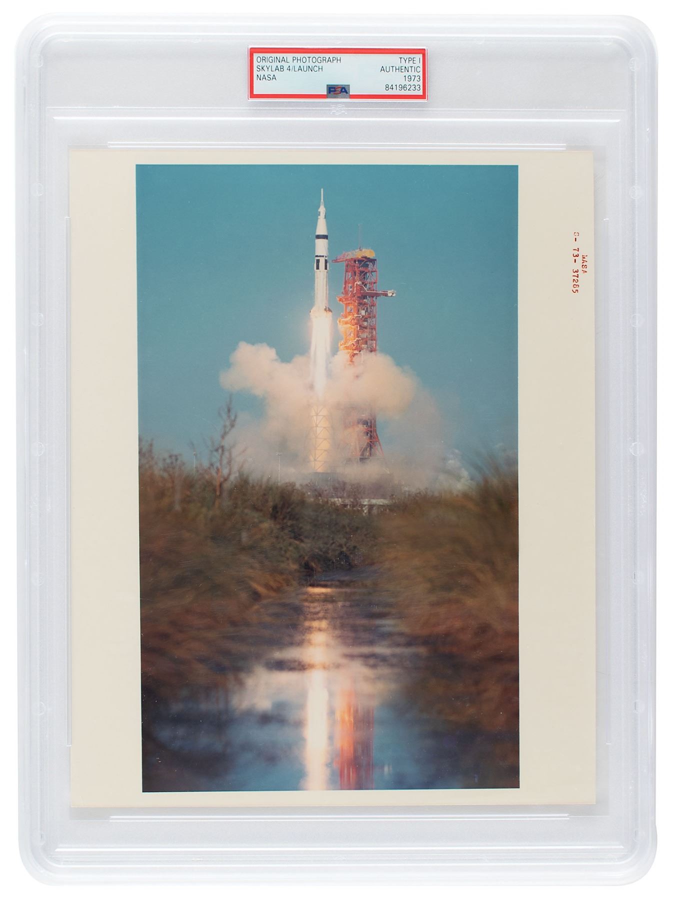 Official 'Type 1' first generation color semi-glossy 8 x 10 red-numbered NASA photo of the launch of the Skylab 4 mission from Pad B, Launch Complex 39, at the Kennedy Space Center on November 16, 1973. The photo, identified as "S–73–37285," features purple NASA caption text and "This Paper Manufactured by Kodak" watermarks to reverse. In fine condition, with a small crease to lower left corner. Encapsulated in a PSA/DNA authentication holder.