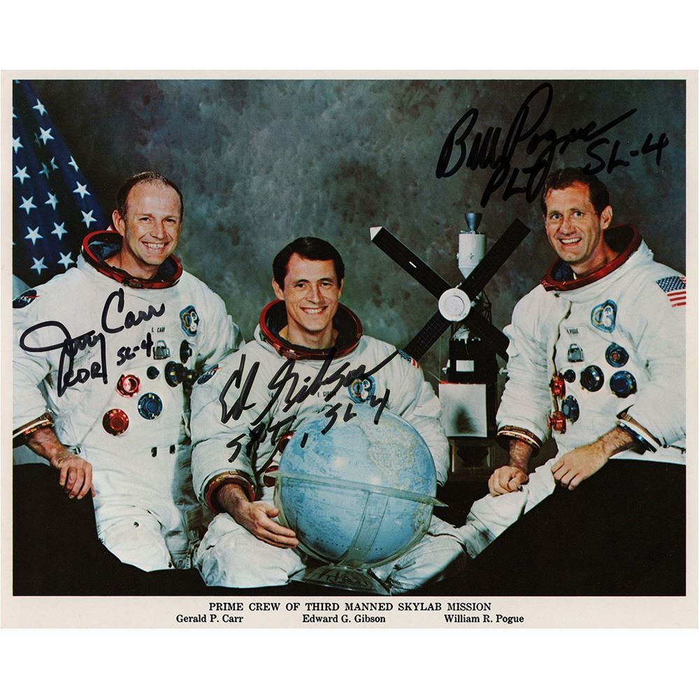 Official color 10 x 8 NASA lithograph of the Skylab 4 crew posing in their white space suits with a globe and model, signed in black felt tip, "Bill Pogue, PLT SL-4," "Jerry Carr, CDR SL-4," and "Ed Gibson, SPT, SL 4." In very good to fine condition, with a light vertical bend.