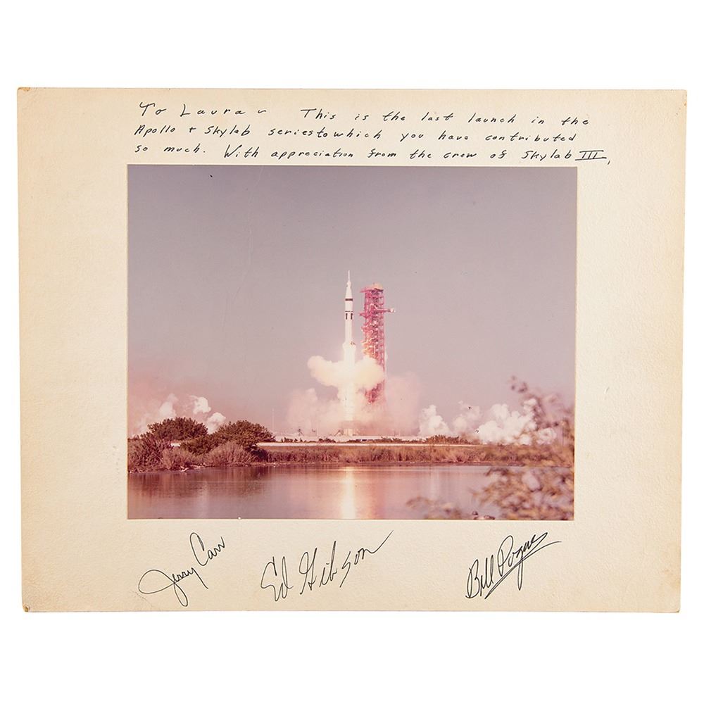 Official color 9.5 x 7.5 NASA photo of the launch of the Skylab 4 mission, affixed to the original 14 x 11 cardstock mount, which is signed below by the crew in black ink, “Jerry Carr,†“Ed Gibson,†and “Bill Pogue,†with one of the astronauts adding an inscription to the upper border, “To Laura—This is the last launch in the Apollo + Skylab series to which you have contributed so much. With appreciation from the crew of Skylab III.†In very good to fine condition, with vertical creasing to the left side of the image, and light toning and soiling to the mount.