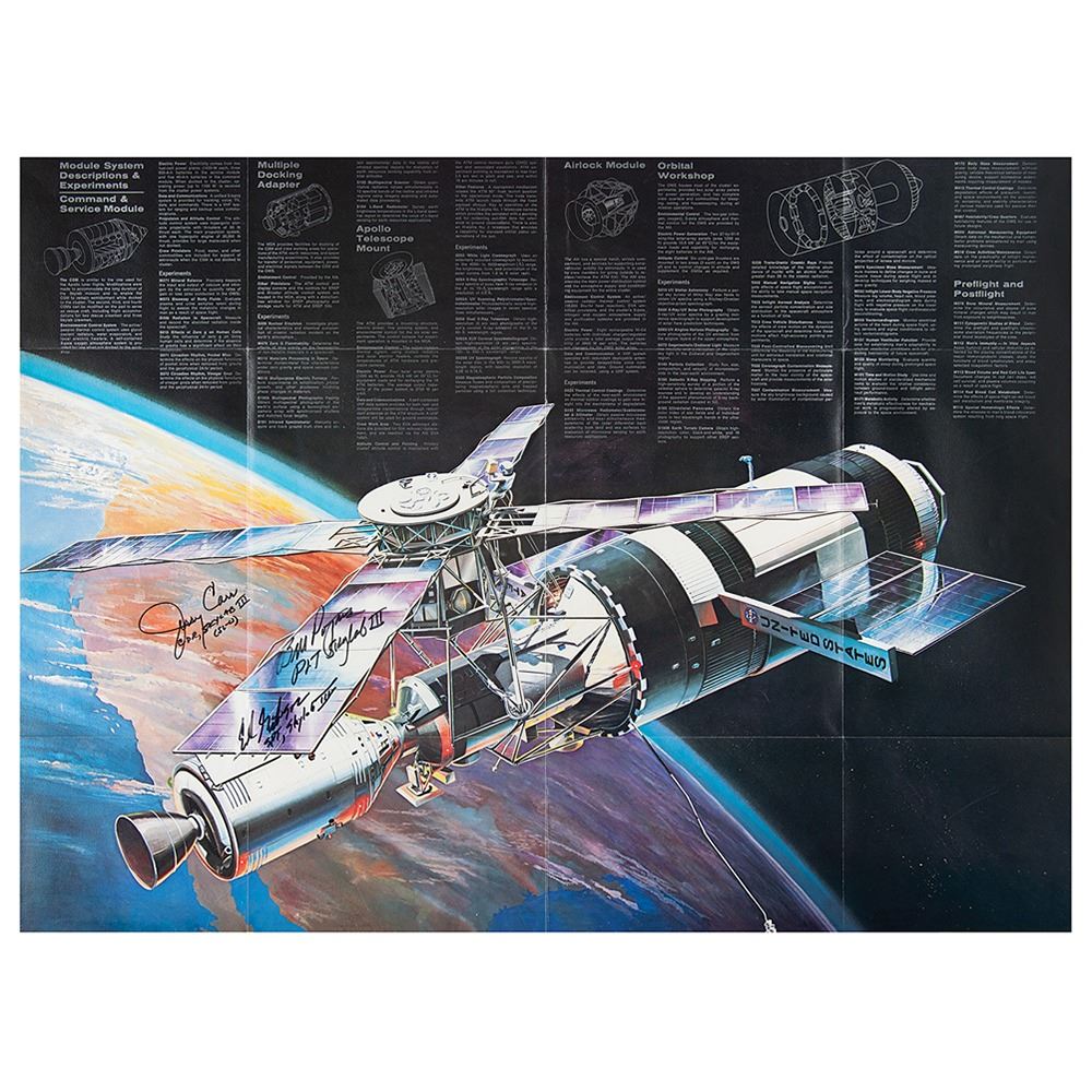 Official Martin Marietta information program for the Skylab space station, which unfolds into an attractive color 30 x 22 poster of Skylab soaring high above Earth, with upper descriptions for the space station’s various modules and instruments, signed in black felt tip by the crew of Skylab 4—“Jerry Carr, CDR, Skylab III (SL-4),†“Bill Pogue, PLT Skylab III,†and “Ed Gibson, SPT Skylab III.†The front of the program bears two Copernicus stamps and is postmarked at Cape Canaveral on November 16, 1973, the launch date of SL-4. In fine condition, with folds as issued, including some light rippling to center vertical fold.