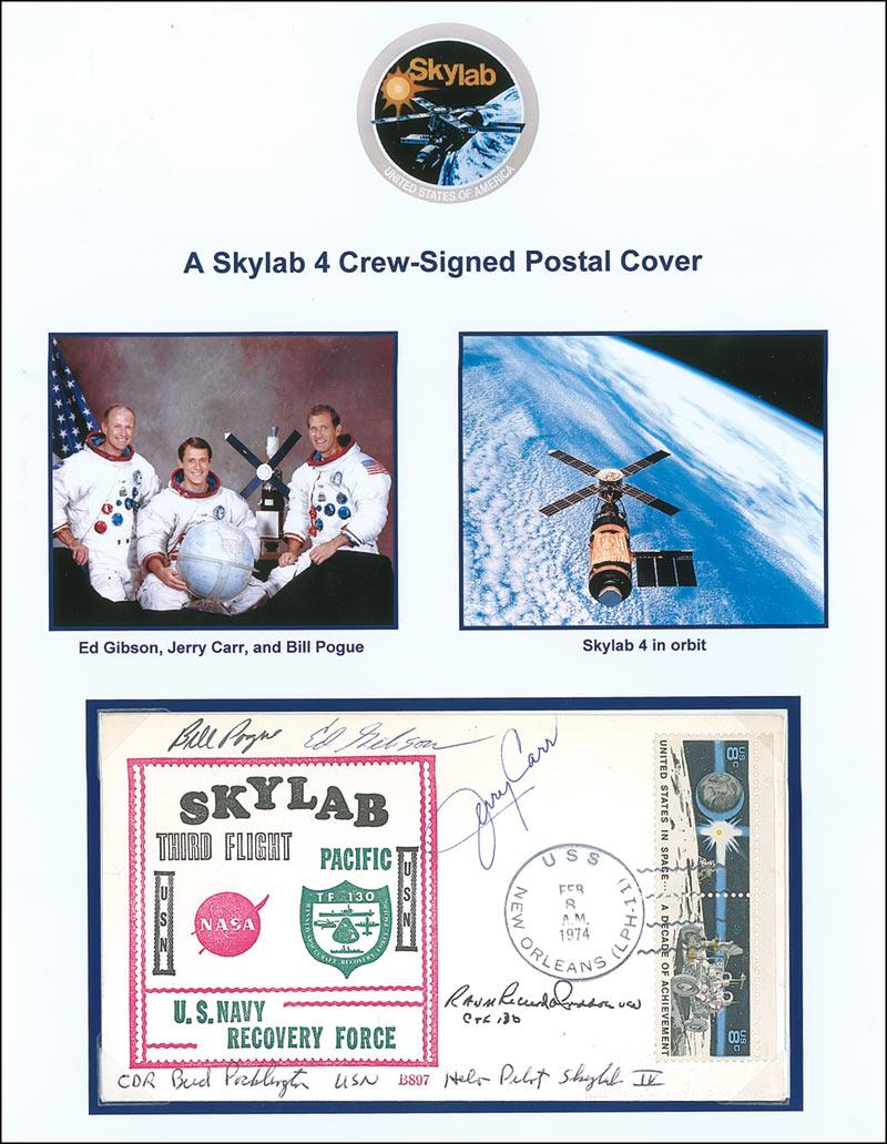 Skylab 4 prime recovery ship cover, with a cachet honoring the recovery force, signed by all three crew members: Ed Gibson, Jerry Carr, and Bill Pogue, and also signed by two recovery officials. Removably presented on a color 8.5 x 11 informational sheet. In fine condition.