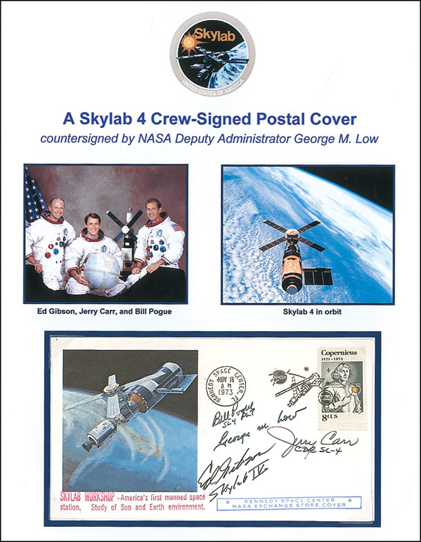 Postal cover honoring Skylab 4, signed in black felt tip by Jerry Carr, Ed Gibson, Bill Pogue, and NASA Deputy Administrator George M. Low. Each astronaut has added a mission-related identifier. Removably presented on a color 8.5 x 11 informational sheet. In fine condition.