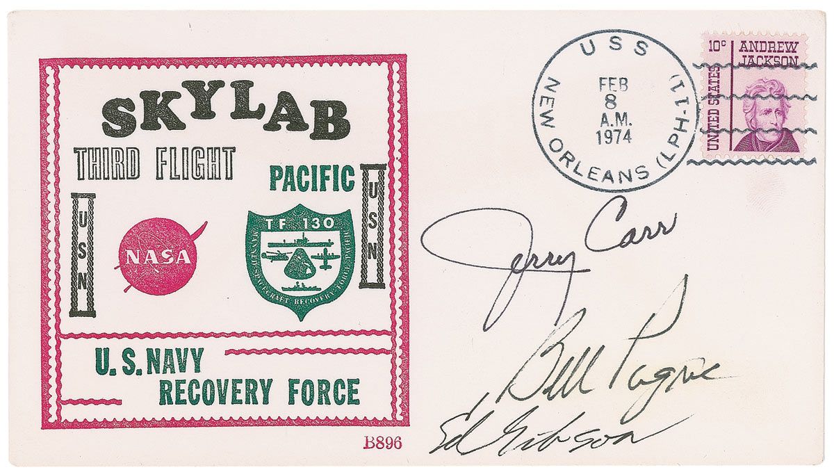 Skylab 4 Naval Recovery cover with a cachet honoring the Naval recovery force, signed on the front in black felt tip by Jerry Carr, Bill Pogue, and Ed Gibson. In fine condition, with light overall haloing to Pogue’s signature.
