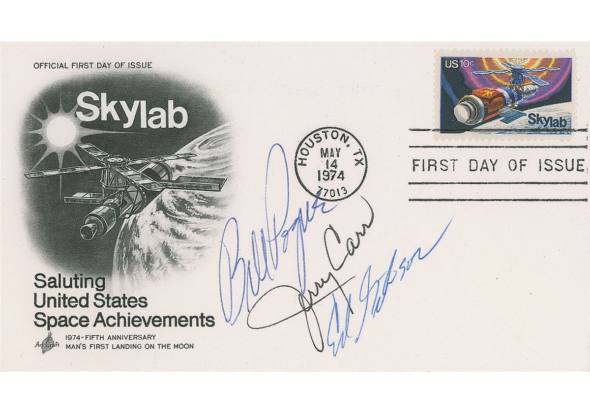 FDC with a cachet honoring Skylab, signed in blue ballpoint by Bill Pogue and Ed Gibson, and black ink by Jerry Carr. In fine condition.
