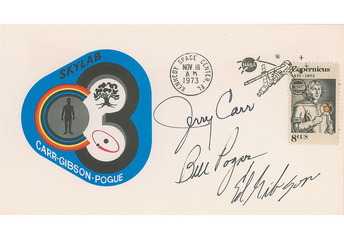Commemorative cover with a cachet honoring the Skylab 3 mission, signed in black felt tip and ink by Jerry Carr, Bill Pogue, and Ed Gibson. In very fine condition.