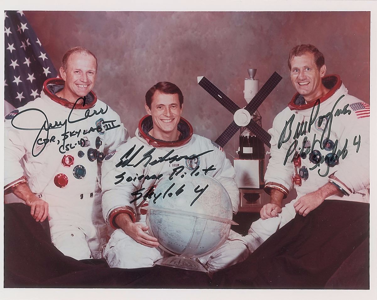 Color satin-finish 10 x 8 photo of the Skylab 4 crew posing in their white space suits, signed in black felt tip, “Jerry Carr, CDR, Skylab III, (SL-4),” “Ed Gibson, Science Pilot, Skylab 4,” and “Bill Pogue, Pilot, Skylab 4.” In fine condition, with trivial brushing to the first letter of Gibson’s surname. Consignor notes that the signatures were obtained in person at a UACC show on June 29, 2001.