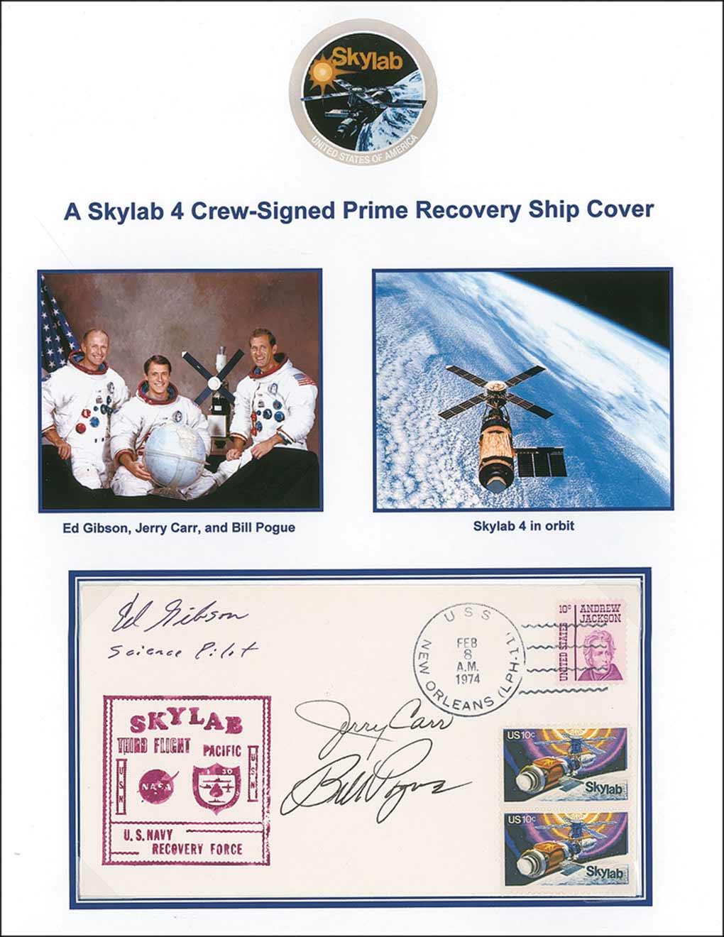 Skylab 4 prime recovery ship cover, signed by all three crew members: Ed Gibson, Jerry Carr, and Bill Pogue. Removably presented on a color 8.5 x 11 informational sheet. In fine condition.