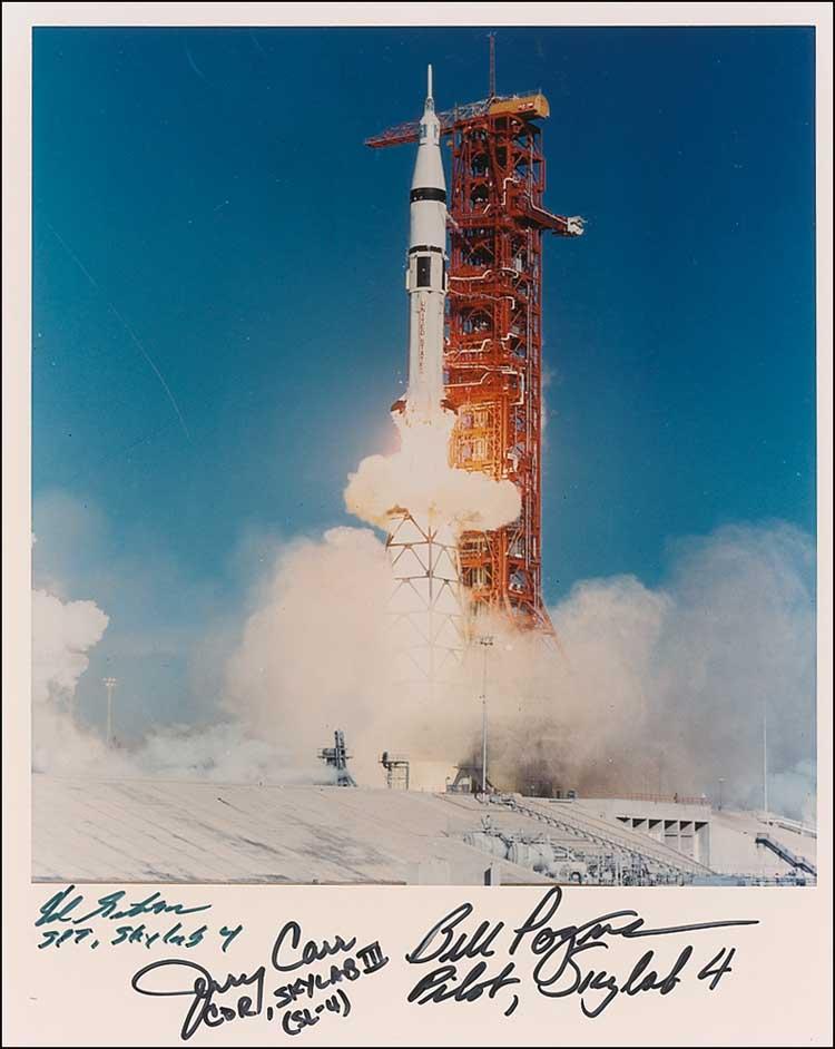 Color satin-finish 8 x 10 photo of the liftoff of the rocket carrying the Skylab 4 crew to their destination, signed in the lower border in black felt tip by Bill Pogue, Jerry Carr, and Ed Gibson, each adding their mission assignment under their signatures. In very fine condition. Pre-certified Scott Cornish and RRAuction COA.