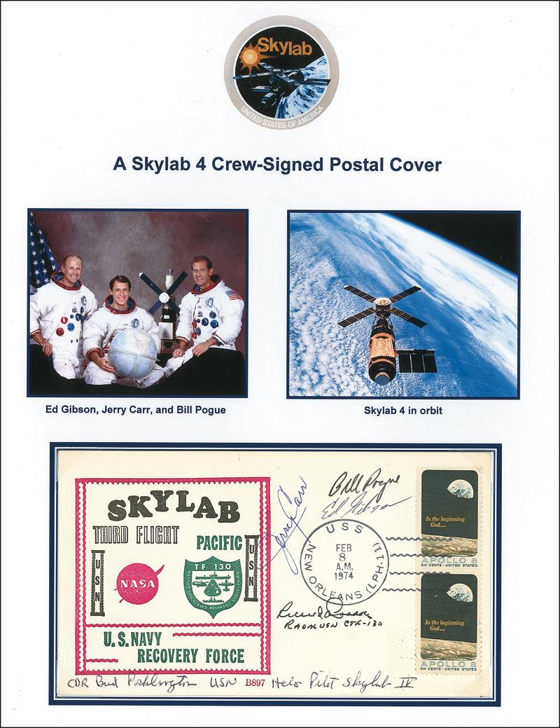 Skylab 4 prime recovery ship cover, signed by all three crew members: Ed Gibson, Jerry Carr, and Bill Pogue. Removably presented on a color 8.5 x 11 informational sheet. In fine condition. Pre-certified Scott Cornish and RRAuction COA.