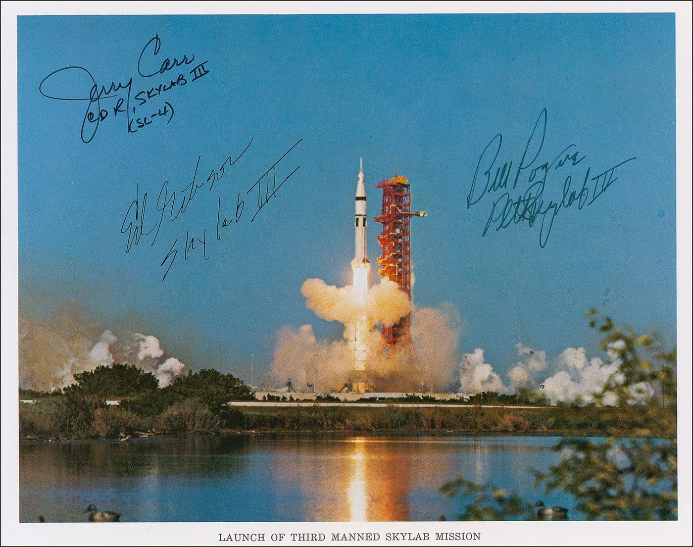 Color 10 x 8 NASA photo of the launch of the third Skylab mission, signed in black felt tip and ink by crew members Ed Gibson, Jerry Carr, and Bill Pogue, each adding their mission under their signatures. In very fine condition.