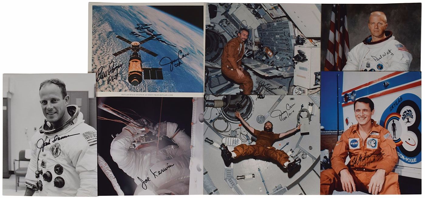 Seven items: an official color 10 x 8 NASA lithograph of the Skylab Space Station hovering over Earth, signed in black felt tip, “Bill Pogue, PLT,” “Ed Gibson, SPT,” and “Jerry Carr, CDR”; and a set of six semi-glossy photos, 8 x 10 and 10 x 8, each signed in black felt tip by the astronaut pictured, including: Jerry Carr, Owen Garriott, Ed Gibson, Joe Kerwin, Jack Lousma, and Paul Weitz. In overall fine to very fine condition. Accompanied by a color 11 x 8.5 cardstock photo of Skylab bearing a 10-cent stamp and a First Day of Issue postmark dated May 14, 1974, and a certificate of authenticity from the Astronaut Scholarship Foundation for the lithograph.
