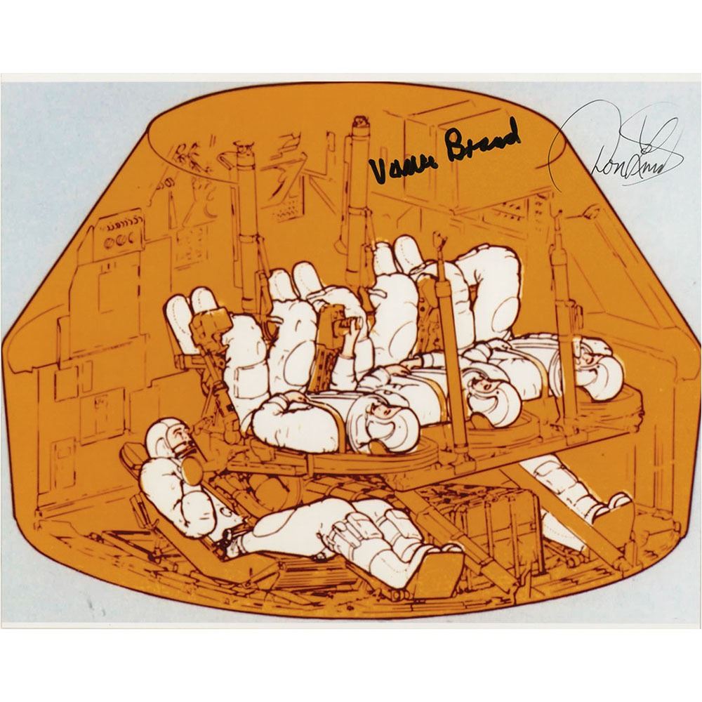 Color glossy 10 x 8 photo of a diagram showing the seating arrangement for the Skylab rescue CSM, signed in black felt tip by Vance Brand and Don Lind. In fine condition. The Skylab Rescue Mission (also SL-R) was a backup rescue flight as part of a contingency plan for the Skylab space station. It used a modified Apollo Command Module that could be launched with a crew of two and return a crew of five.