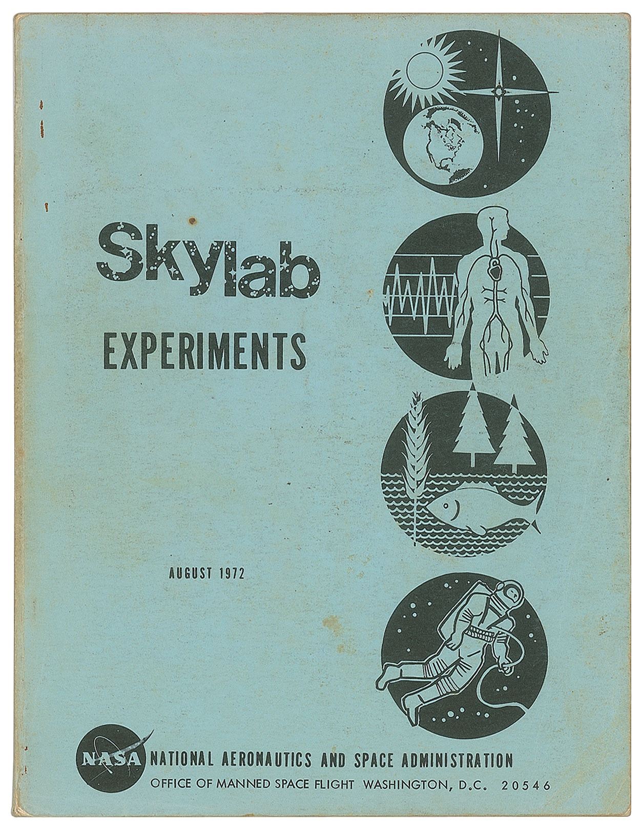 Two items: an official NASA manual entitled "Skylab Experiments," printed by the Office of Manned Space Flight, 211 pages, 7.75 x 10.25, dated August 1972, containing a total of seven chapters—The Skylab Experiment Program, Life Sciences, Solar Physics, Earth Observations, Astrophysics, Material Science and Manufacturing in Space, and Engineering and Technology Experiments—with an additional appendix of 13 sections relating to radiation, thermal control coatings, crew quarters, astronaut maneuvering equipment, navigation sightings, and more; and a large color first edition of the Skylab 4 (SL-4) Mission Chart, 56 x 23.75, dated November 1, 1973, showing the orbit groundtrack data for the mission's first 71 revolutions. Lithographed by DMAAC 11-73 (3CTEA-DJ8), and prepared and published by the Defense Mapping Agency Aerospace Center. In very good to fine condition, with soiling and toning to the covers of the booklet; the map is in fine, folded condition.