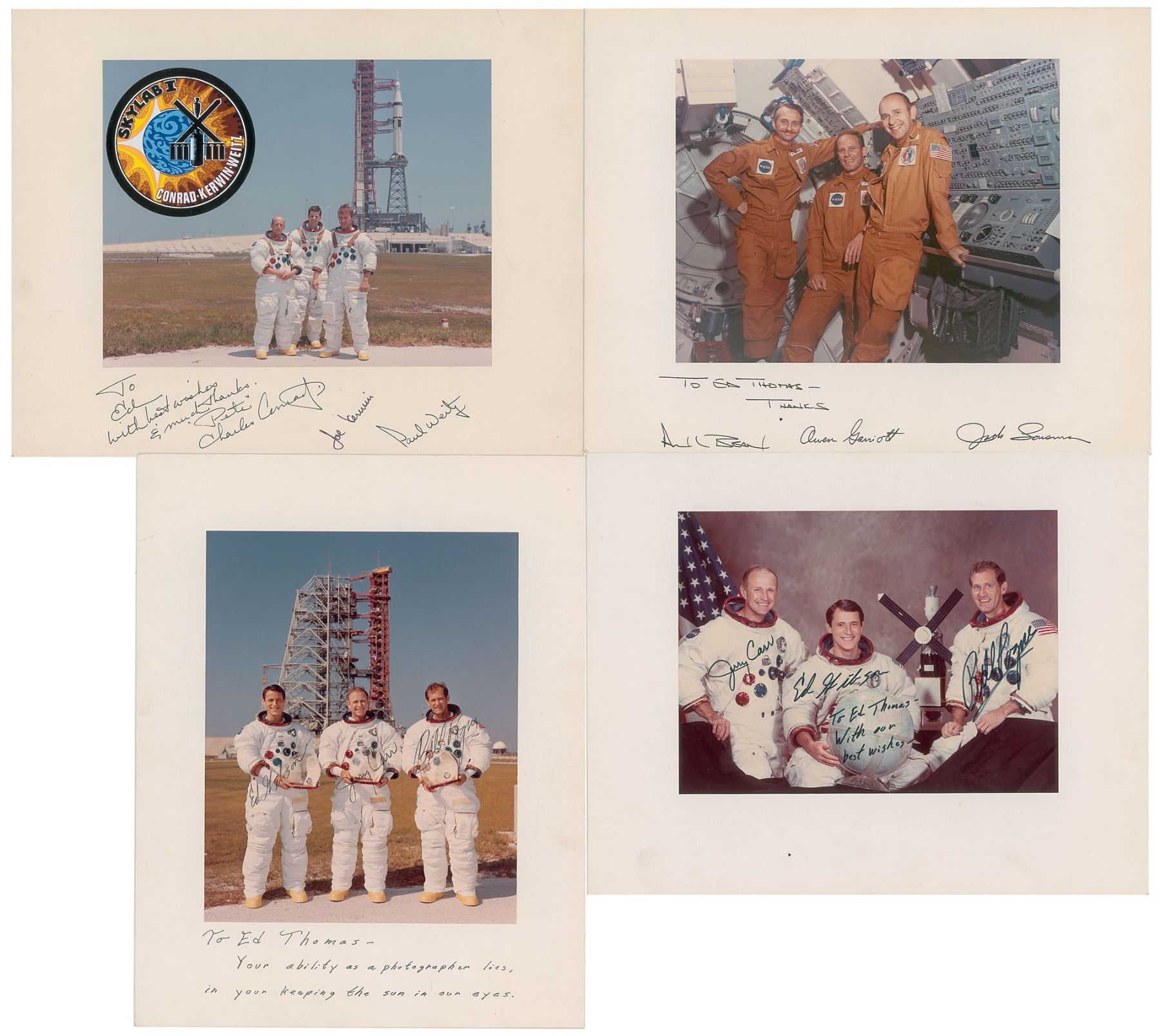 Four official color semi-glossy NASA photos of the three Skylab mission crews, each approximately 9.5 x 7.5 or 7.5 x 9.5, and affixed to individual cardstock mounts measuring 14 x 11 or 11 x 14. The Skylab 2 and 3 photos are signed and inscribed on their respective mounts in black ink or felt tip: "To Ed, with best wishes & much thanks, 'Pete,' Charles Conrad," "Joe Kerwin," and "Paul Weitz," and "To Ed Thomas—Thanks, Alan L. Bean," "Owen Garriott," and "Jack Lousma." The seated Skylab 4 photo is signed and inscribed in black felt tip on the photo, "To Ed Thomas—with our best wishes—Ed Gibson," "Jerry Carr," and "Bill Pogue," and the full-length photo is signed on the photo, "Jerry Carr," "Bill Pogue," and "Ed Gibson," who adds an inscription to the mount, "To Ed Thomas—Your ability as a photographer lies, in your keeping the sun in our eyes." Skylab II photo bears an affixed mission emblem logo. In overall fine condition, with trivial soiling and edgewear to mounts, and weak ink adhesion to full-length Skylab 4 photo.