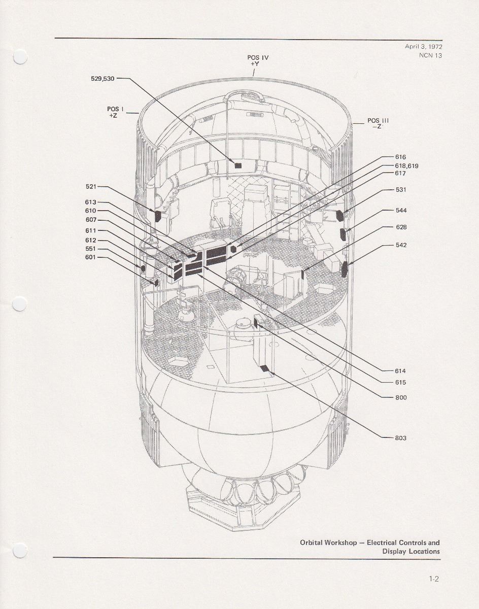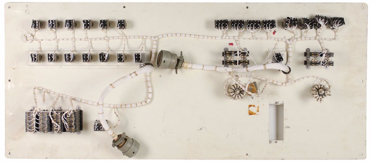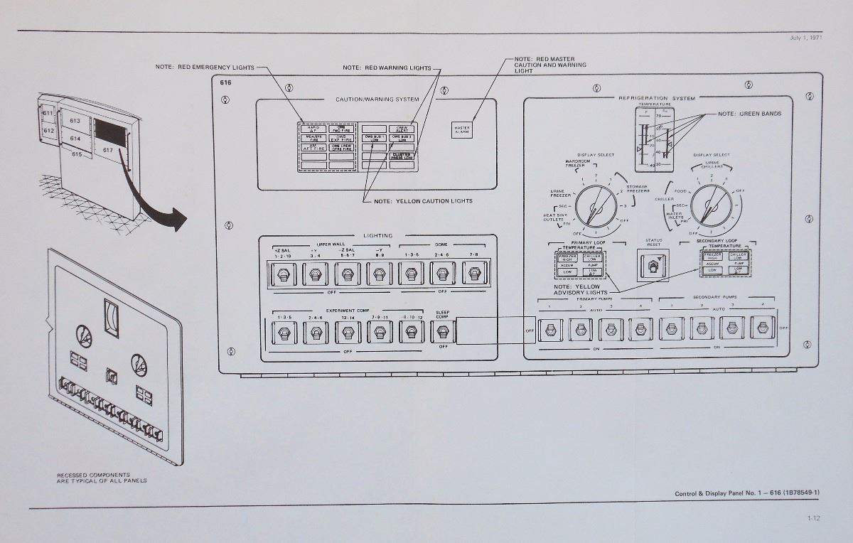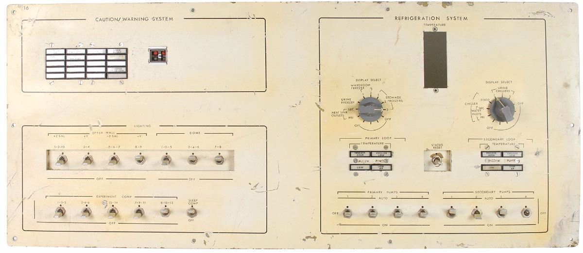 An engineering mock-up of Skylab control panel #16, nearly identical to the flight version launched in the Skylab Workshop during May 1973. The panel was located in the central area of the Workshop near the crew quarters section. Panel measures 35 x 15 with controls for two separate systems. Left side of the panel is labeled at the top, “Caution Warning System,” with 20 indicator lights labeled with warnings for fire, low power, and pressure. Lower half of system has two rows of toggle switches for lighting throughout the lab. Right side of panel is labeled “Refrigeration System,” with two selection knobs for display selection, including, “Stowage Freezers,” “Urine Freezer,” and “Water Inlets.” Below the knobs are indicator lights for both the primary and secondary loops, and eight switches for the system pumps along the bottom. Panel retains all of its circuitry and both umbilicals, but is missing the temperature gauge from the upper right. In very good to fine condition, with scattered dings and wear. Accompanied by three paper copy printouts from an internal manual titled ‘Orbital Workshop Operational Nomenclature’ published by McDonnell Douglas Corporation, dated July 1971 and April 1972, which have the exact layout of this panel plus position maps of the exact location inside Skylab. A particularly early design of an important internal system.