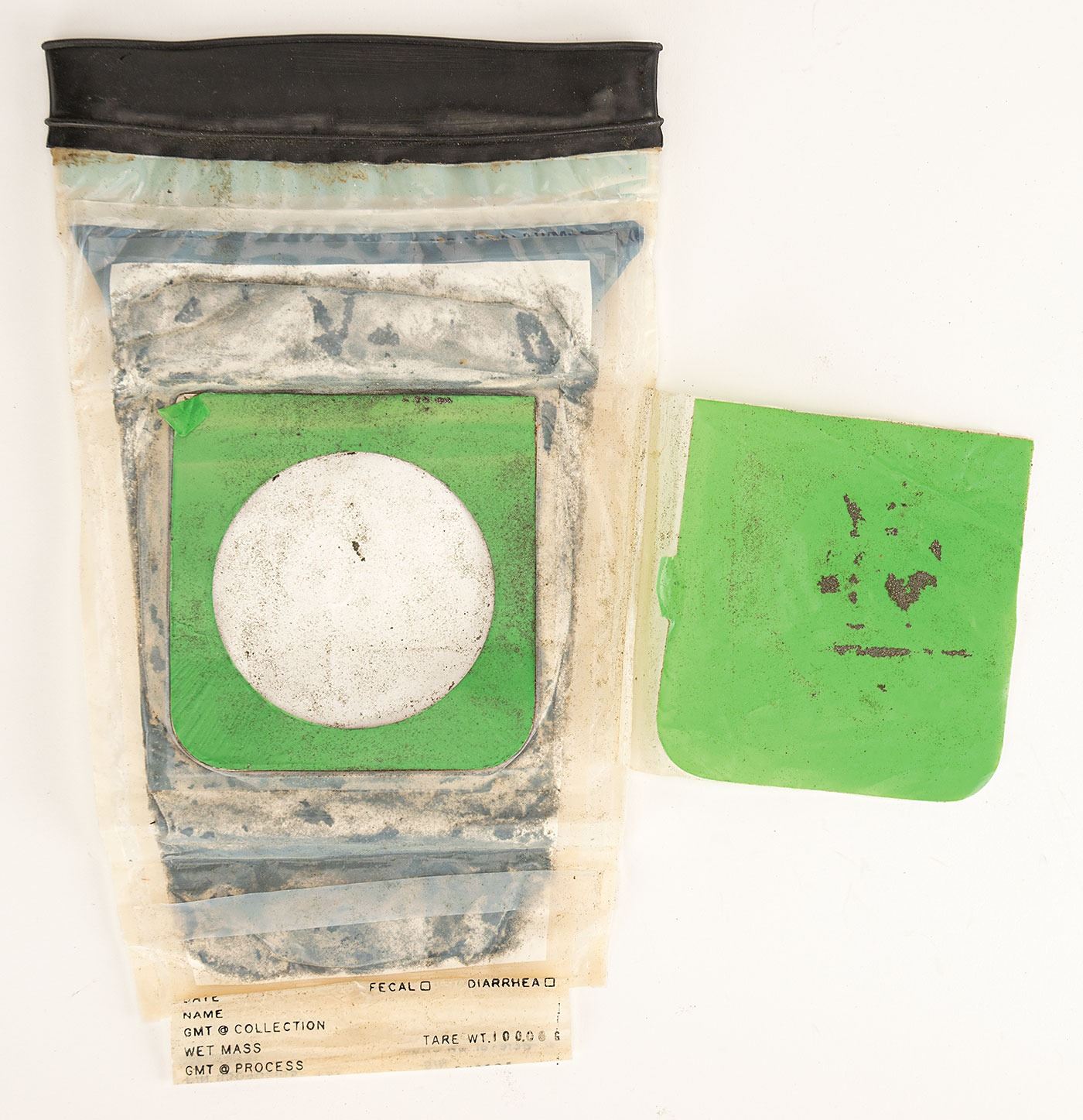 Skylab fecal mass collection bag, measures 7.75? x 12.25? overall, with plastic parts label marked, "P/N 115D402103-101, S/N FH2585, MDAC No. IB79138," and rim of rubber fitting reading: "1150402101-3, Rev.C, 2072 73X, 927/M-72/73-9F." In fine condition.