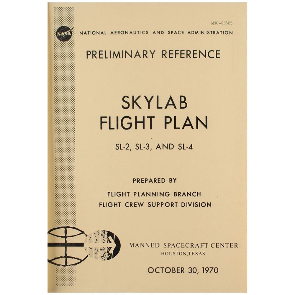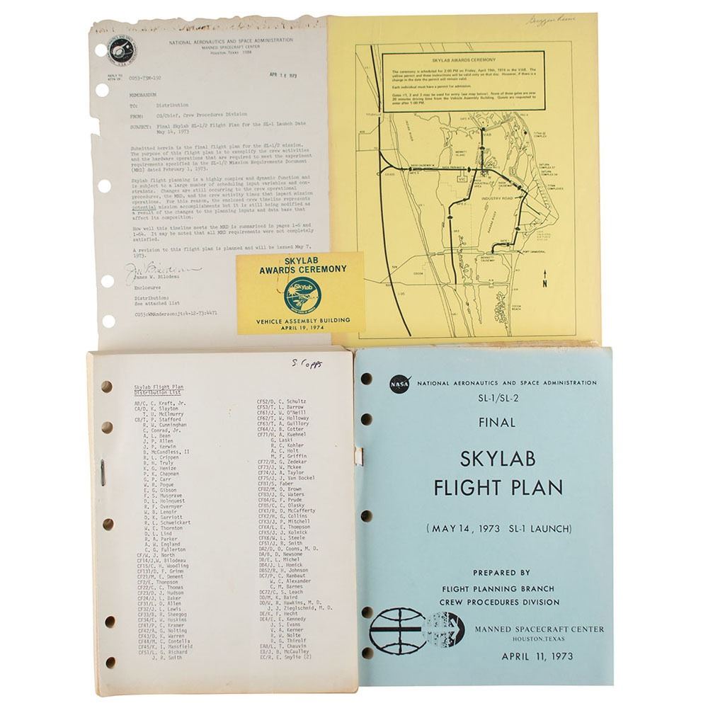 Two staple-bound Skylab flight plans: a "Preliminary Reference: Skylab Flight Plan, SL-2, SL-3, and SL-4," prepared by the Manned Spacecraft Center's Flight Crew Support Division, October 30, 1970, 8 x 10.5, 590 pages, with a lengthy distribution list stapled to the front; and a "SL-1/SL-2 Final Skylab Flight Plan (May 14, 1973, SL-1 Launch)," prepared by the Manned Spacecraft Center's Crew Procedures Division, April 11, 1973, 8 x 10.5, 252 pages, April 11, 1973. Both provide detailed timelines and descriptions of activities for the Skylab flights. In fine condition, with some scattered staining and insect damage to edges of the later flight plan. Accompanied by a cover letter memo for the SL-1/SL-2 Final Skylab Flight Plan, and a map and admission permit for the "Skylab Awards Ceremony" held on April 19, 1974.