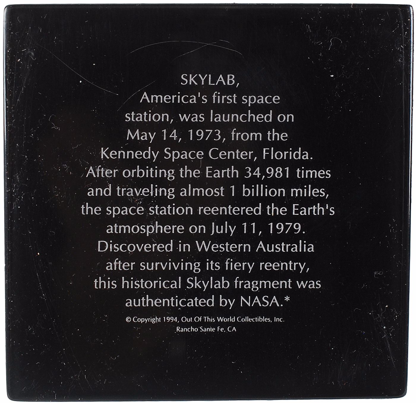 Flown fragment of a Skylab oxygen supply tank recovered in Western Australia after the space station’s fiery reentry in 1979, approximately 1.5 x 1.5, encased in a pyramidal 3.5 x 4 x 3.5 block of Lucite with a Skylab emblem at the bottom. In fine condition. Accompanied by its original Skylab display box.