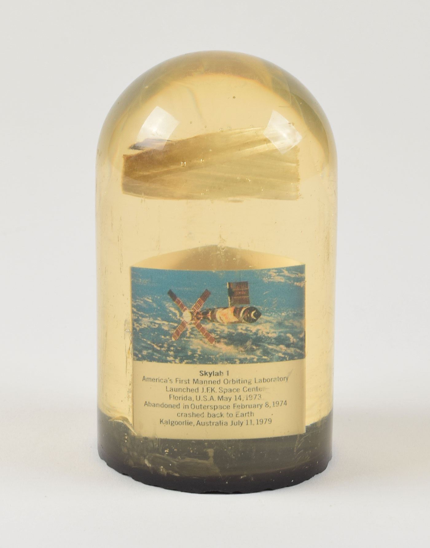 Flown fragment of a Skylab oxygen supply tank recovered by three people at Rawlinna Ranch in Western Australia. The fragment approximately measures 1.75? x .75? and is presented in a 4.25? tall acrylic display above a small copy of a photo of the recovered tank, information on Skylab, and a 1979 letter from the leader of the NASA Skylab Team, sending thanks for assistance in the recovery. In fine condition.