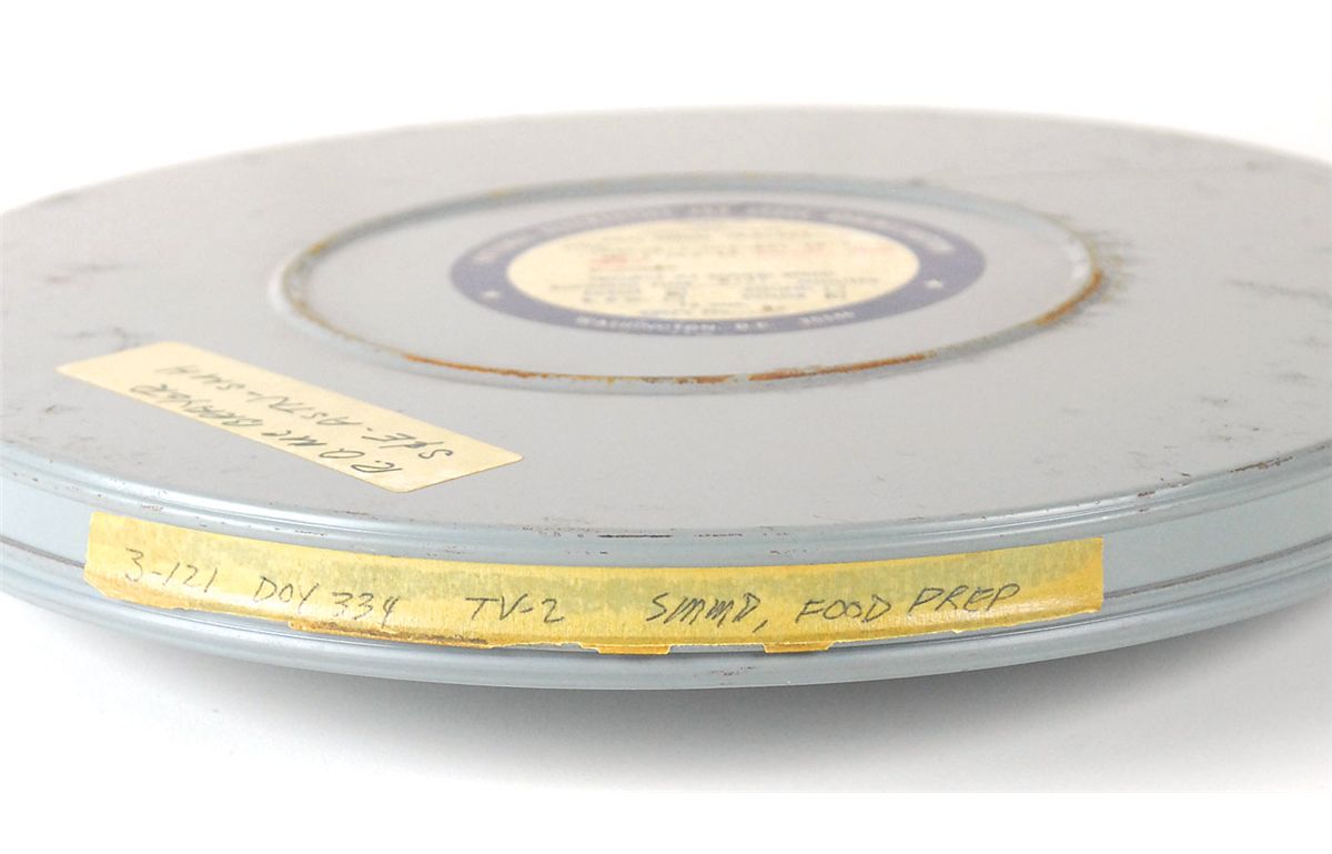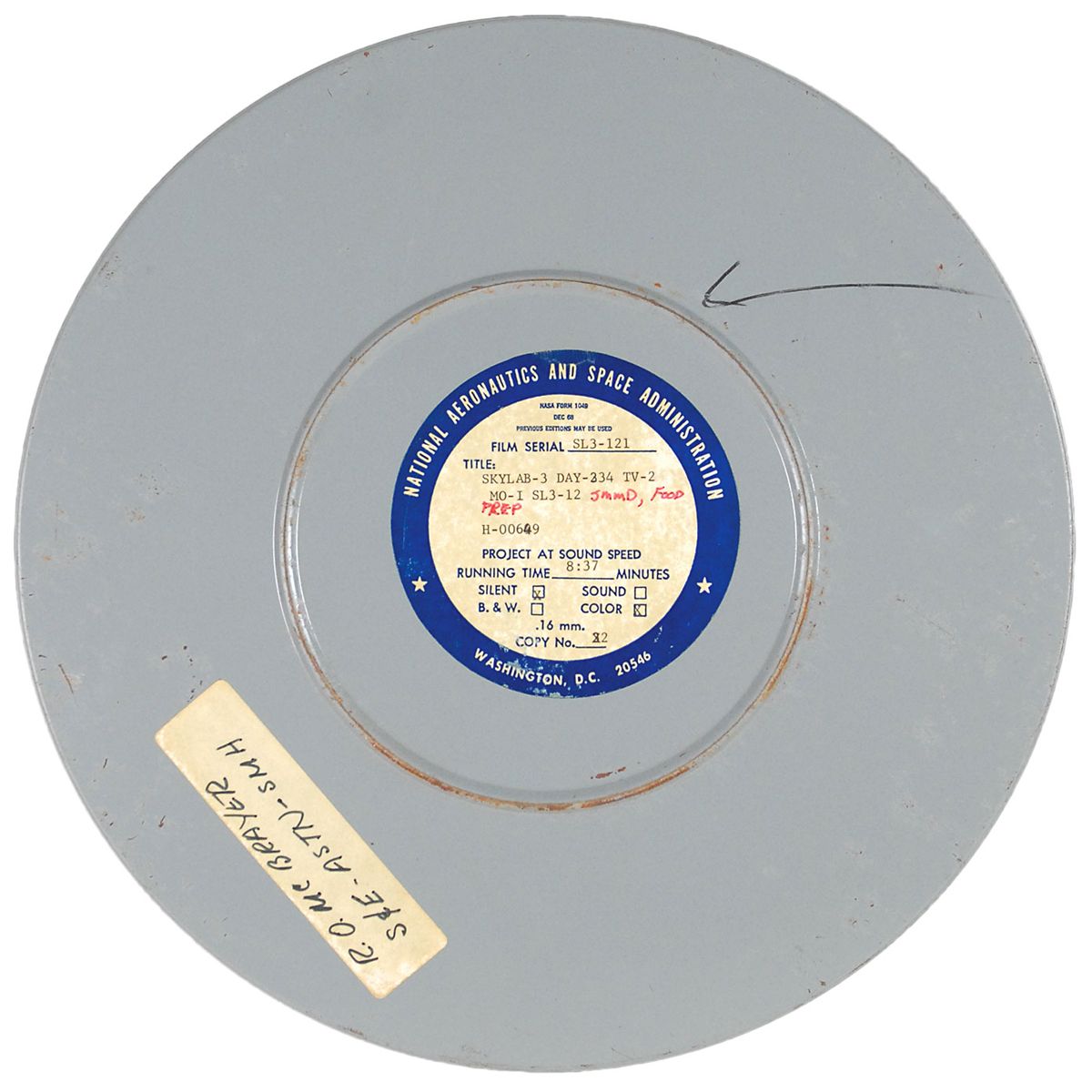 Original canister of 16mm film from the Skylab 3 (II) mission. Canister measures 10.75? in diameter, and contains one reel of silent color film. NASA label affixed to the cover reads, in part: “Skylab-3 Day -234 TV-2,” with additional handwritten notations which read, “SMMD, Food Prep.” Film runs eight minutes and 37 seconds in length, and has notations written on a strip of masking tape along the side of the cover, as well as a handwritten label on the top of the cover. In fine condition.