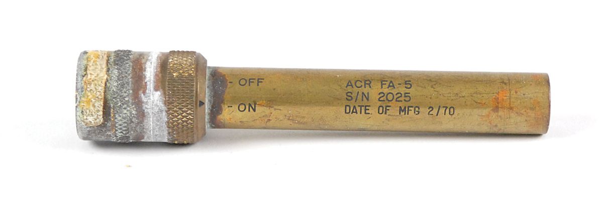 Flown penlight carried on board Skylab 2. Brass-milled two-cell light measures 5.25? long, with “ACR FA-5, S/N 2025, Date of Mfg. 2/70,” stamped on the handle. A small swatch of Velcro is affixed on the rim of the lens. In fine condition, with light wear and some scattered areas of tarnishing. Included is a photo of Lousma posing with the flashlight.