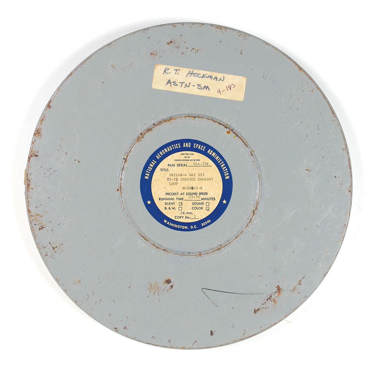 Original canister of 16mm film from the Skylab 4 (III) mission. Canister measures 12.5? in diameter, and contains one reel of silent color film. NASA label affixed to the cover reads, in part: “Skylab-4 Day -258 TV-72 Service Coolant Loop,” with a running time of 25:20. Cover also bears a second label with a handwritten notation, as well as notations written on a strip of masking tape along the side of the cover. In fine condition.