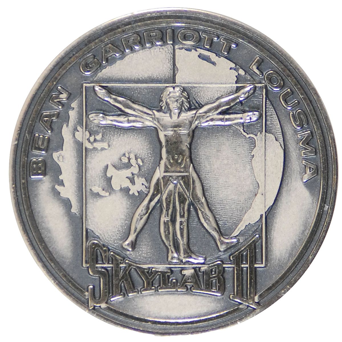 Skylab II Robbins medallion, unflown, approximately 1.25” diameter, with a raised design of the mission insignia on the face, and the mission and astronauts’ names. The reverse of the sterling silver medallion depicts the Skylab space station with the July 28–September 25,1973, mission dates engraved. This medal is serial numbered along the rim, “062,” along with the sterling and Robbins hallmarks. Condition is mint state. Accompanied by a hand written letter of authenticity from Sue Bean, the wife of Alan Bean, the mission's Commander, which states, in full: “Skylab II medallion, number 062, is an unflown Robbins medallion from the Bean family personal collection. My husband, Alan, flew on Apollo XII and Skylab II.” Also included is a photo of astronaut Alan Bean holding the actual medallion. Robbins medallions from the collection of that flight's Commander, like this one, are always the most desirable.