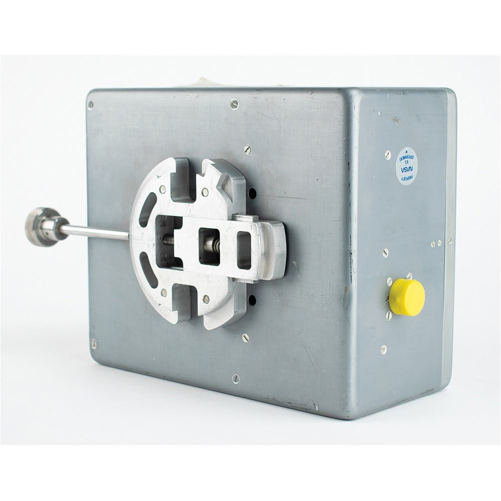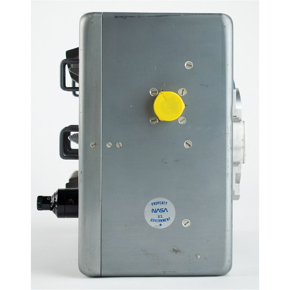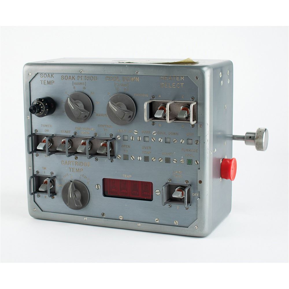 Control panel for the Skylab Materials Science Furnace, which supported a number of experiments to study various properties of materials in a microgravity environment. The box measures 10˝ x 6˝ x 8.5˝ and features controls for various heating and cool-down modes, including several selector switches, adjustment knobs for "Soak Temp," "Soak Period," "Cool Down," and "Cartridge Temp," and a digital temperature readout display. The back has a substantial mounting fixture with threaded adjustment device. On the top are handwritten numbers and an affixed tag reading: "Item #2, P/S 10, 1 or 2, 7-0-10-00160, Lehozcky, ES75" (a noteworthy name, as Dr. Sandor 'Alex' Lehoczky was later one of NASA's leading researchers on the effects of gravitational forces on compositional and crystal quality in complex alloys during the Space Shuttle era). A NASA property label is affixed to one side.