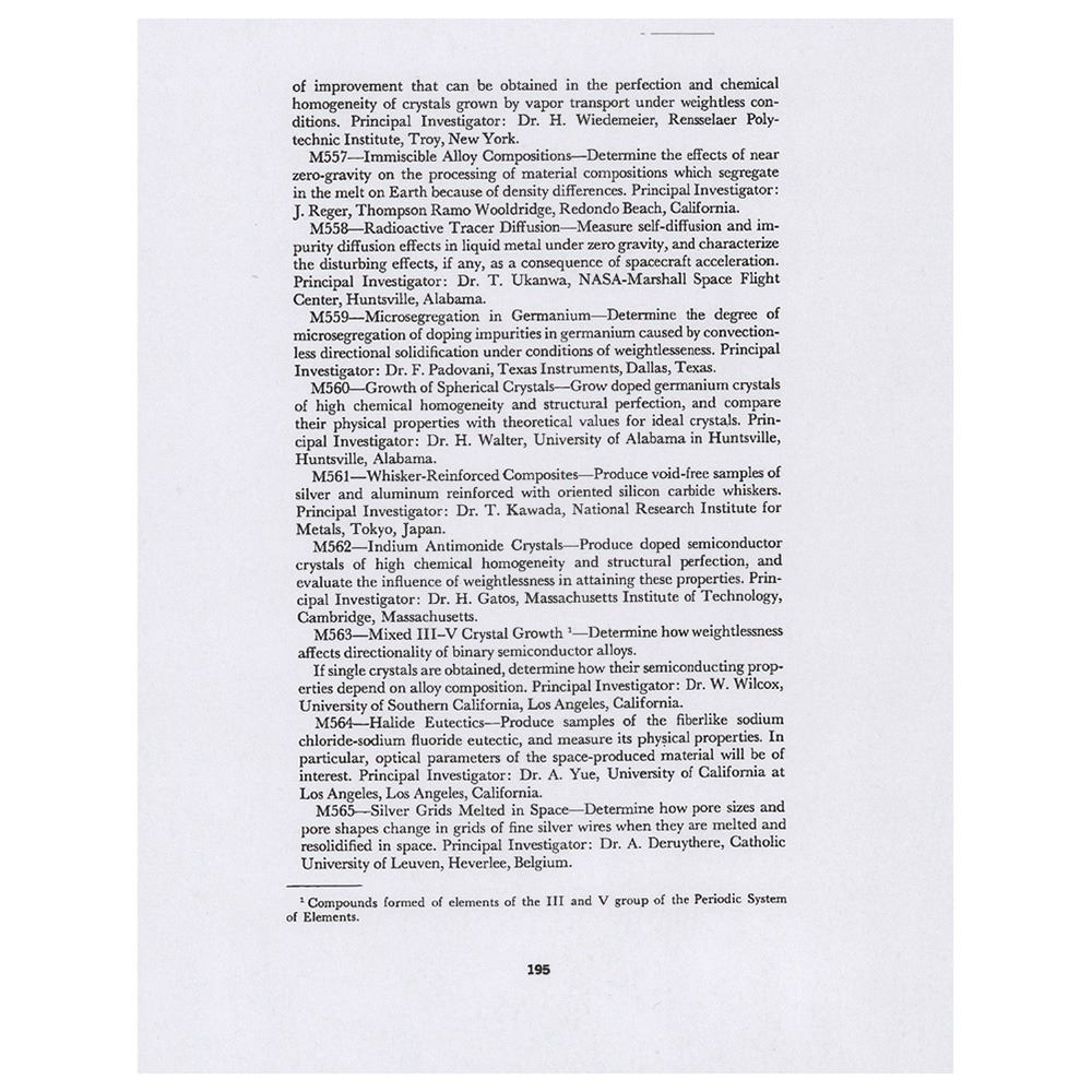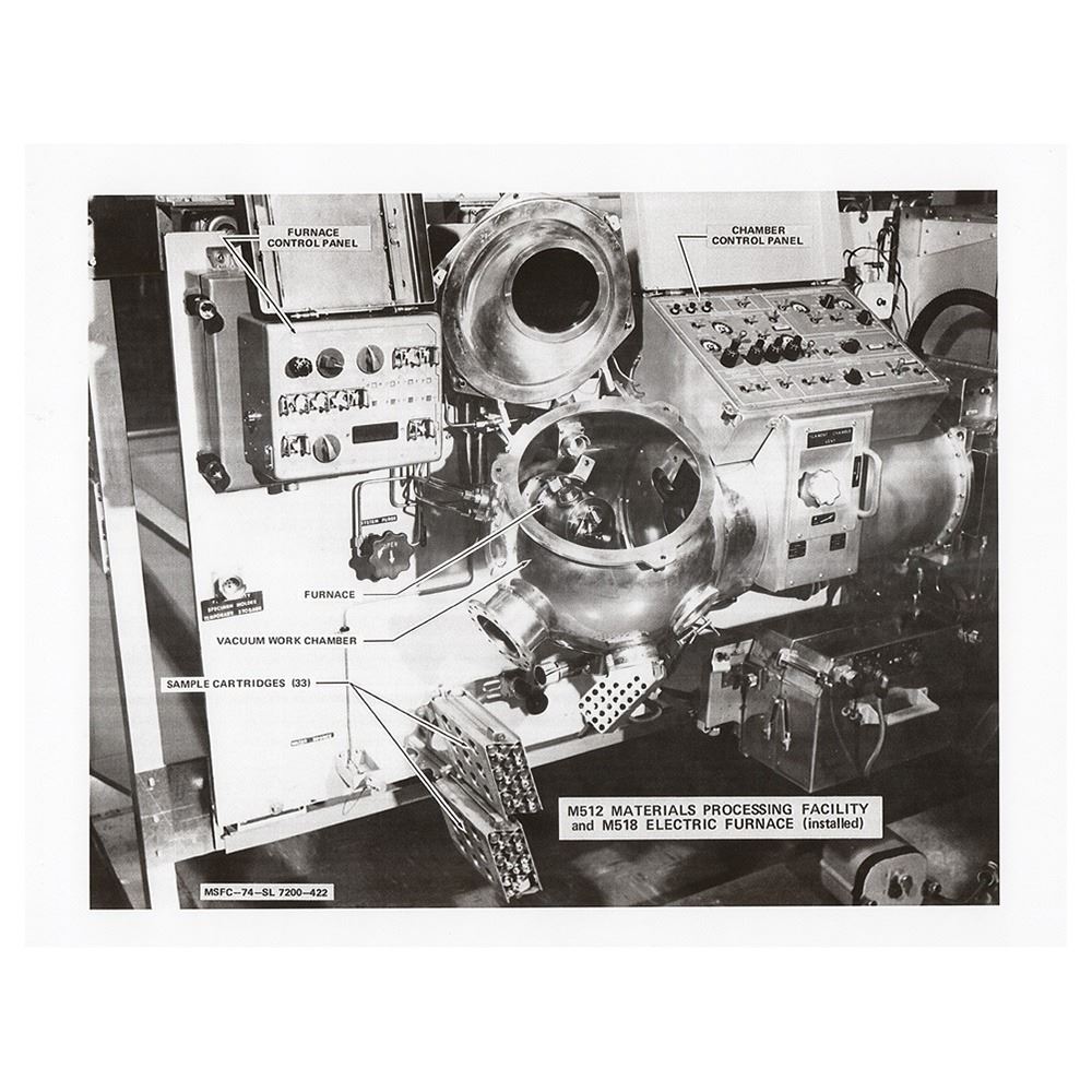 The Skylab M518 Electric Furnace was part of the M512 Materials Processing Facility, located in the Multiple Docking Adapter (MDA), one of the primary elements of the Skylab space station. This equipment was designed to provide a means for experimentation in solidification, crystal growth, composite structures, alloy structural characteristics, and other thermal processes involving changes in materials under conditions of weightlessness.