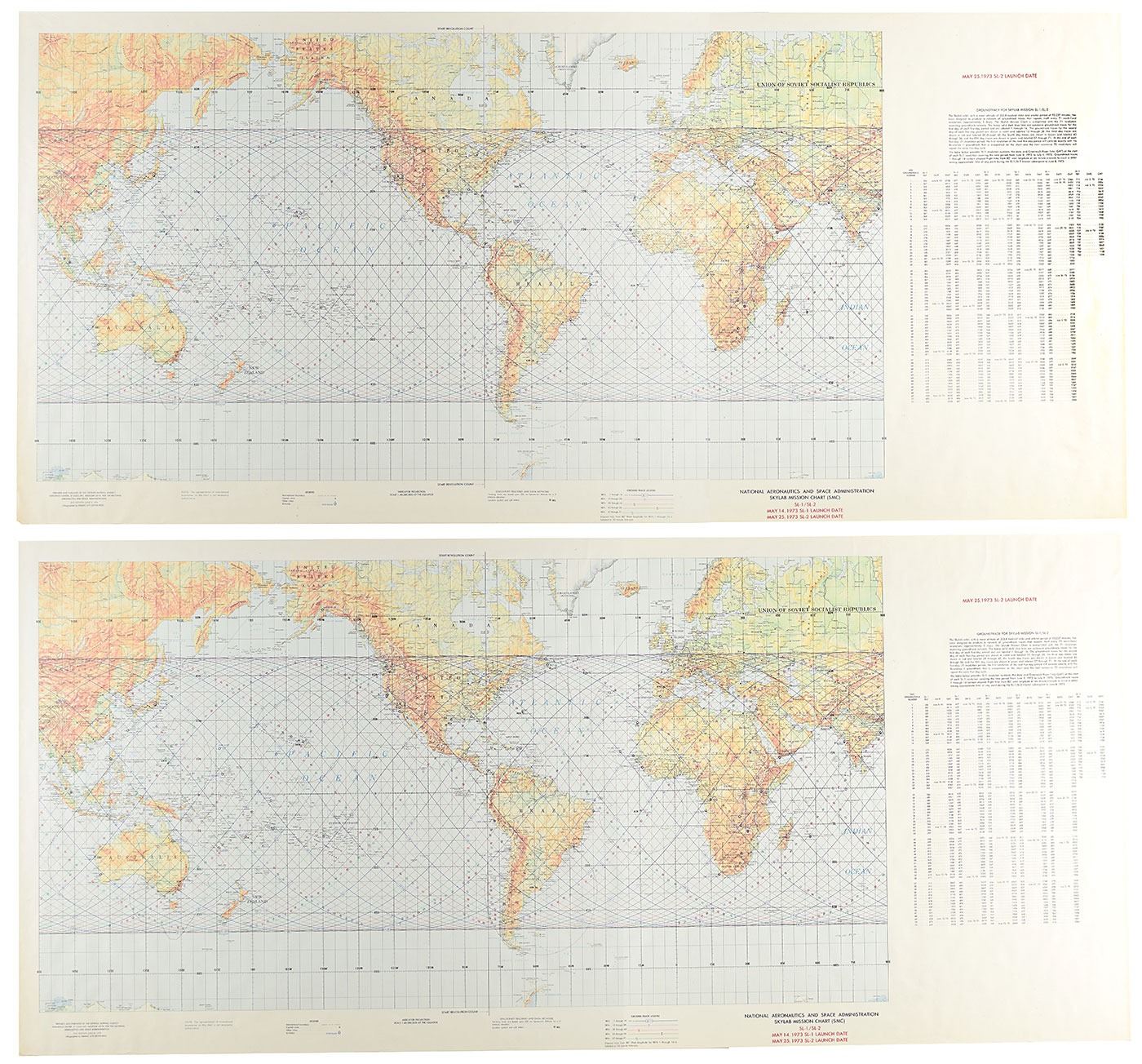 Attractive pair of color second edition mission charts for the Skylab 1 (SL-1) and Skylab 2 (SL-2) missions, both 51.5 x 23.75, dated June 8, 1973, showing ground-tracking lines for the first 71 orbits of the Skylab space station, with right border featuring a table that provides SL-1 revolution numbers, the date, and Greenwich Mean Time at the start of each SL-1 revolution covering the time period from June 8, 1973 to July 4, 1973, which amounts to a total of 735 orbits. Prepared and published by the Defense Mapping Agency Aerospace Center for NASA. Rolled and in overall fine condition, with light wear to edges.