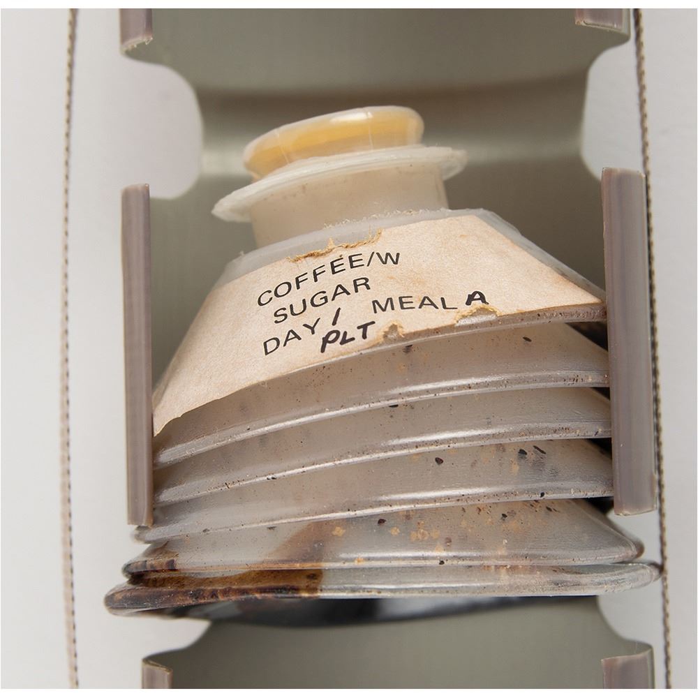 Skylab Medical Experiment Altitude Test (SMEAT) cylindrical aluminum meal/beverage canister, measuring 15.5è long and 3è in diameter, labeled on the outside: "SMEAT No‰Û_.SPT‰Û_Pudding," with annotations for "Day" and "Meal." Inside is a lightweight storage rack for hydratable beverage packs, retaining one labeled "Coffee/w Sugar, Day 1, Meal A, PLT." Complete with its screw-on cap. In very good to fine condition, with overall wear and soiling.