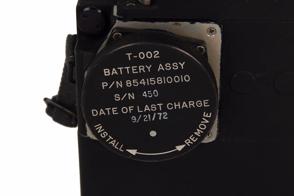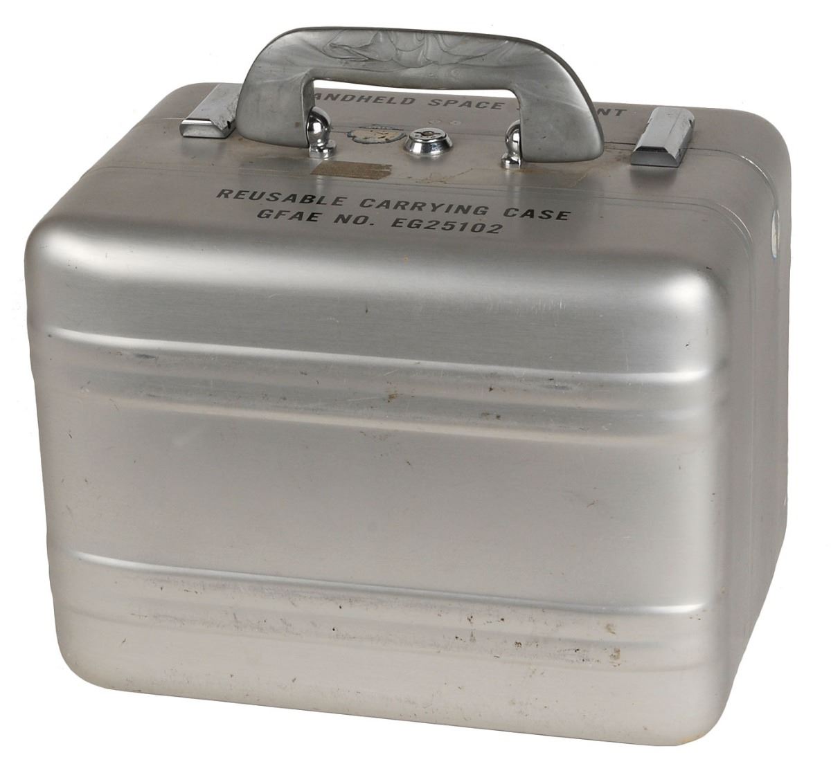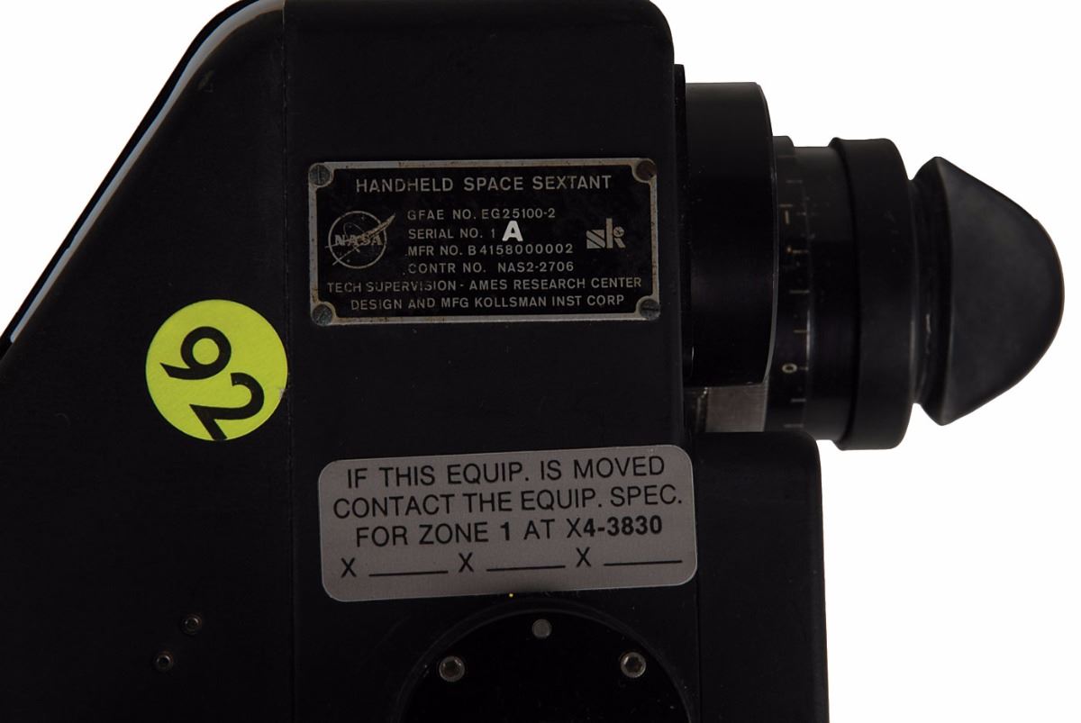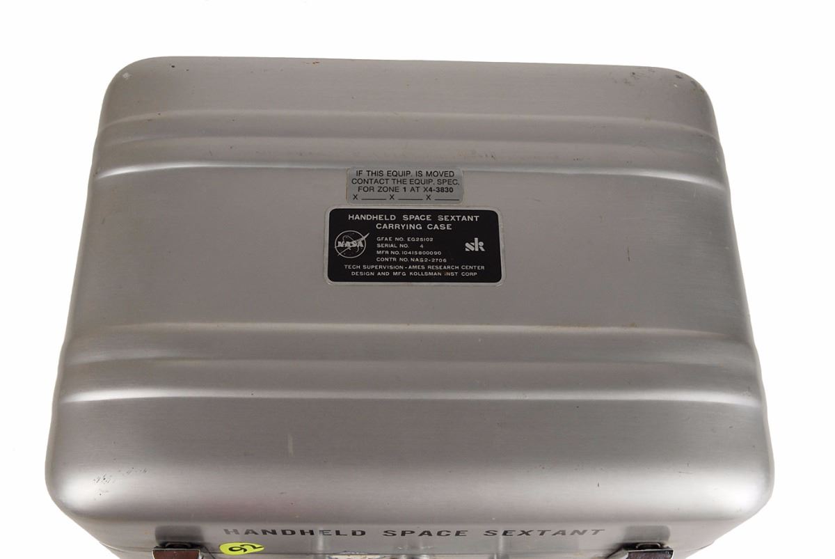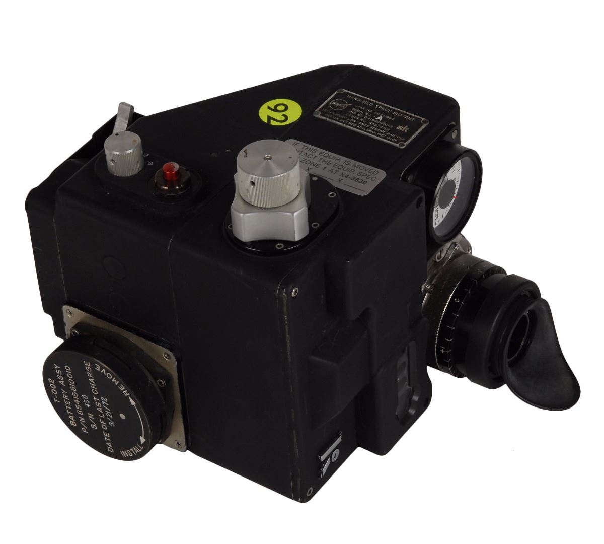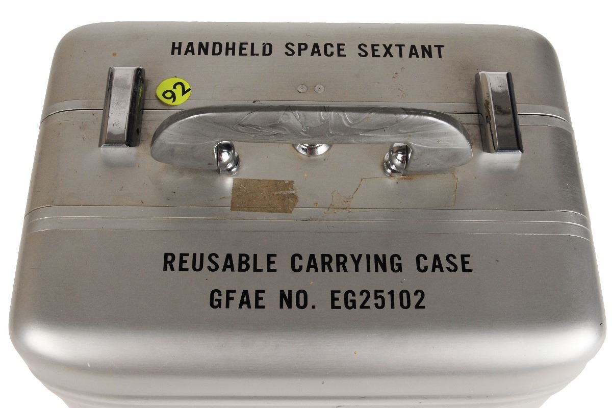 Space sextant designated for use by the astronauts during the T002 Manual Navigation experiment on the second and third Skylab missions, measuring approximately 9 x 7 x 6, with a NASA parts tag on one side, reading: “Handheld Space Sextant, GFAE No. EG25100-2, Serial No. 1A, Mfr. No. B4158000003, Contr. No. NAS2-2706.” Includes a lens and metal carrying case. In fine condition. The sextant was designed to measure the angle between the lines of sight to two known stars, a star and a lunar limb or landmark, or two opposite lunar limbs. In the Skylab T002 experiment this capability was leveraged to investigate the feasibility of a manual navigation system for use in back-up applications and to investigate the capability of the crew to make the necessary celestial observations accurately and with precision under conditions of long term space travel. A superb piece of space-age manual navigation hardware.