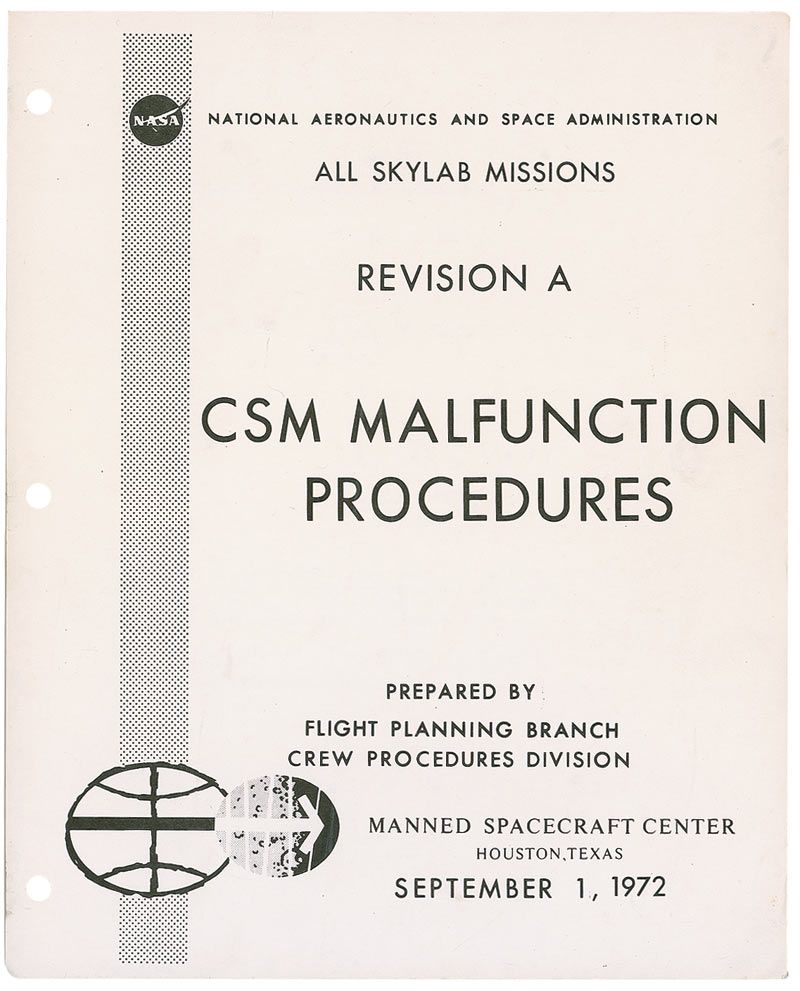 NASA CSM Malfunction Procedures manual, Revision A, 8.5 x 11, prepared by the Flight Planning Branch, Crew Procedures Division, and dated September 1, 1972. The unbound manual provides detailed procedures, via instructions and flow charts, for CSM malfunctions. In fine condition, with expected handling wear and some light page curling.