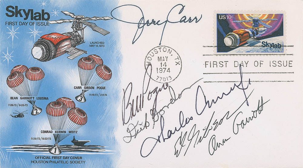 FDC with a cachet honoring the Skylab missions, signed in black ink by Jerry Carr, Bill Pogue, Dick Gordon, Charles Conrad, Ed Gibson, and Owen Garriott. In very fine condition.