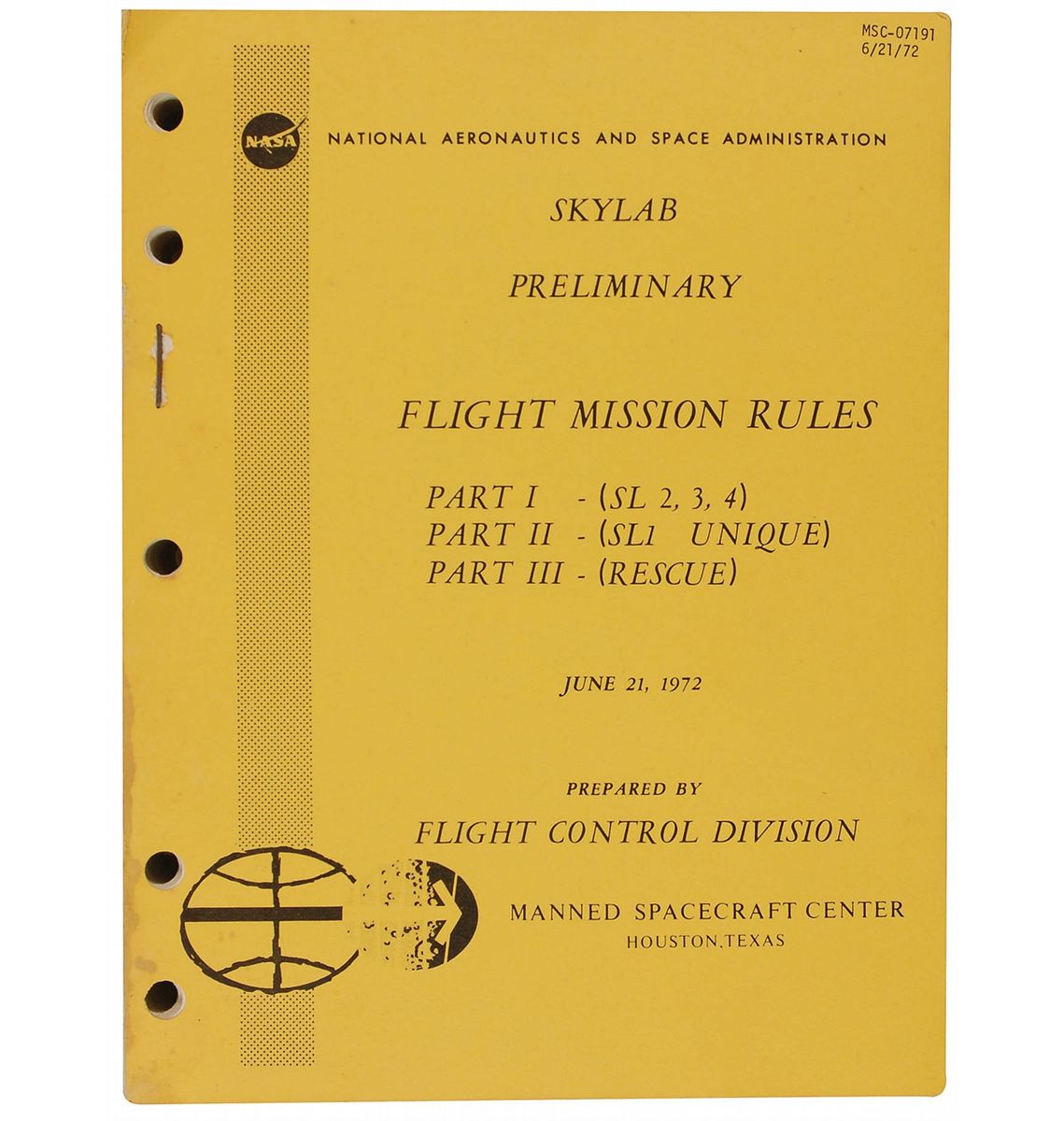 Huge printed manual entitled “Skylab Preliminary Flight Mission Rules,” Parts1-3, dated June 21, 1972, 8 x 10.5, bound by a single staple in the left edge. General introduction states, in part: “The flight mission rules outline preplanned decisions to minimize the amount of real-time rationalization required when non-nominal situations occur during the terminal countdown and the flight. Sections in the manual include Flight Operations Rules, Communications, ATM Experiments, and Space Environment.” In fine condition, with some light dampstaining and foxing to covers.