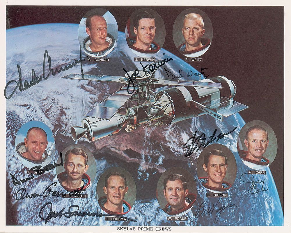 Color 10 x 8 NASA ‘floating heads’ photo, signed in black felt tip by all nine astronauts: Charles Conrad, Joe Kerwin, Paul Weitz, Alan Bean, Owen Garriott, Jack Lousma, Jerry Carr, Ed Gibson, and Bill Pogue. In fine condition, with trivial surface marks to the upper left corner.
