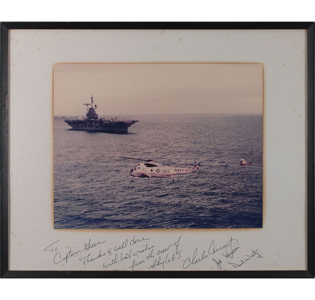 Color vintage 13.5 x 11 photo of the recovery of the Skylab I crew, affixed to its original 19.5 x 15.5 mount, signed and inscribed on the mount in black ink to the captain of the USS Ticonderoga, “To Captain Green, Thanks & well done with the best wishes from the crew of Skylab I, Charles Conrad,” “Joe Kerwin,” and “Paul Weitz.” In fine condition, with a thin line of toning around edge of image and some scattered light foxing to mount.