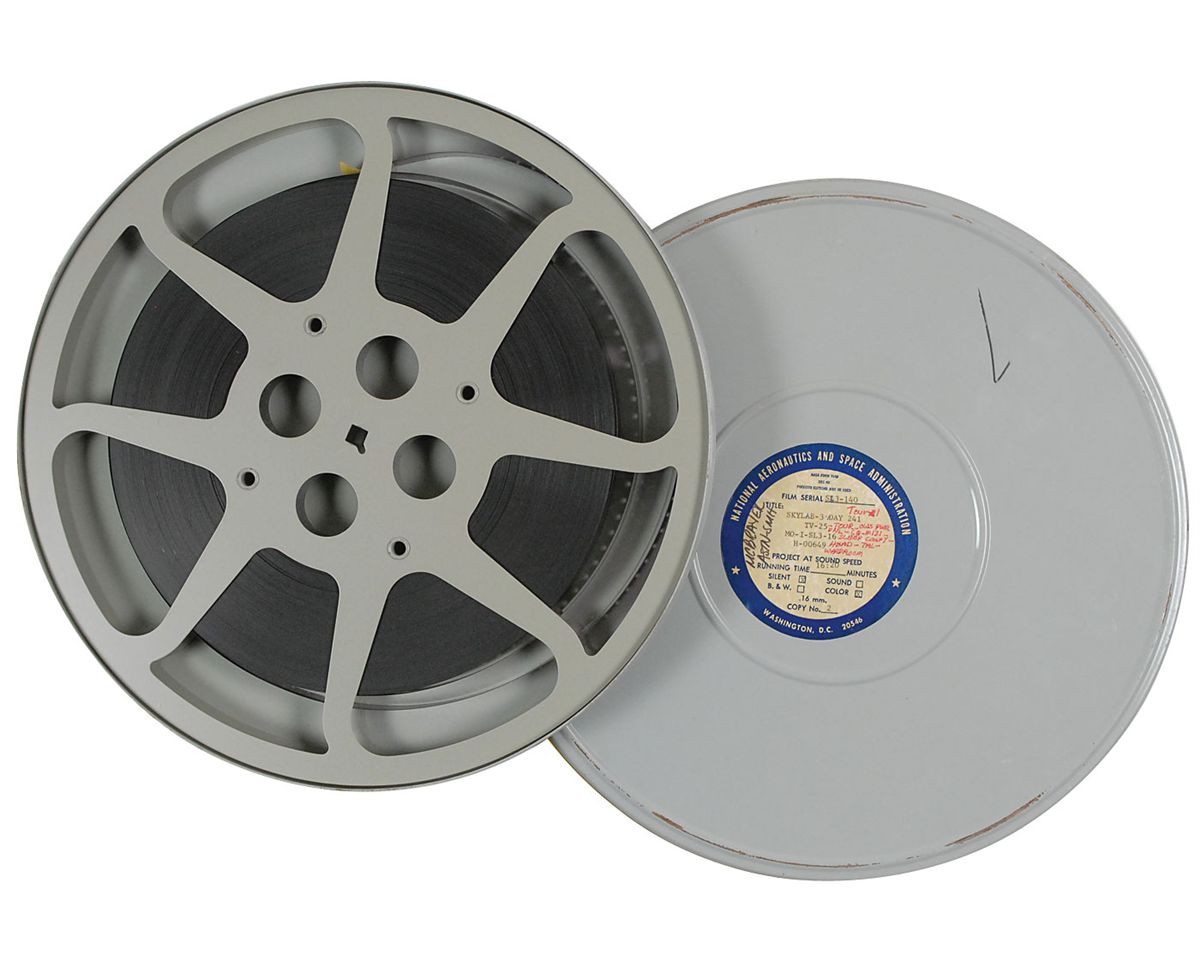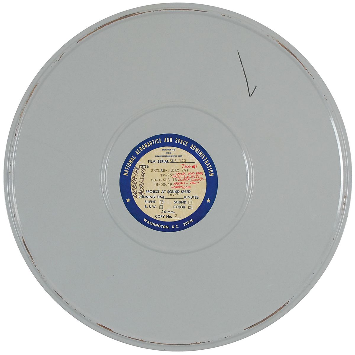 Original canister of 16mm film from the Skylab 3 mission. Canister measures 12.5? in diameter, and contains one reel of silent color film. NASA label affixed to the cover reads, in part: “Skylab-3 Day -241 TV-25,” with handwritten notations which read, “Tour OWS Pwr Pnl—CQ—M131—Sleep Compt—Hlsad—TAL—Wardroom.” Film runs 16:20 in length, and has notations written on a strip of masking tape along the side of the cover. In fine condition.