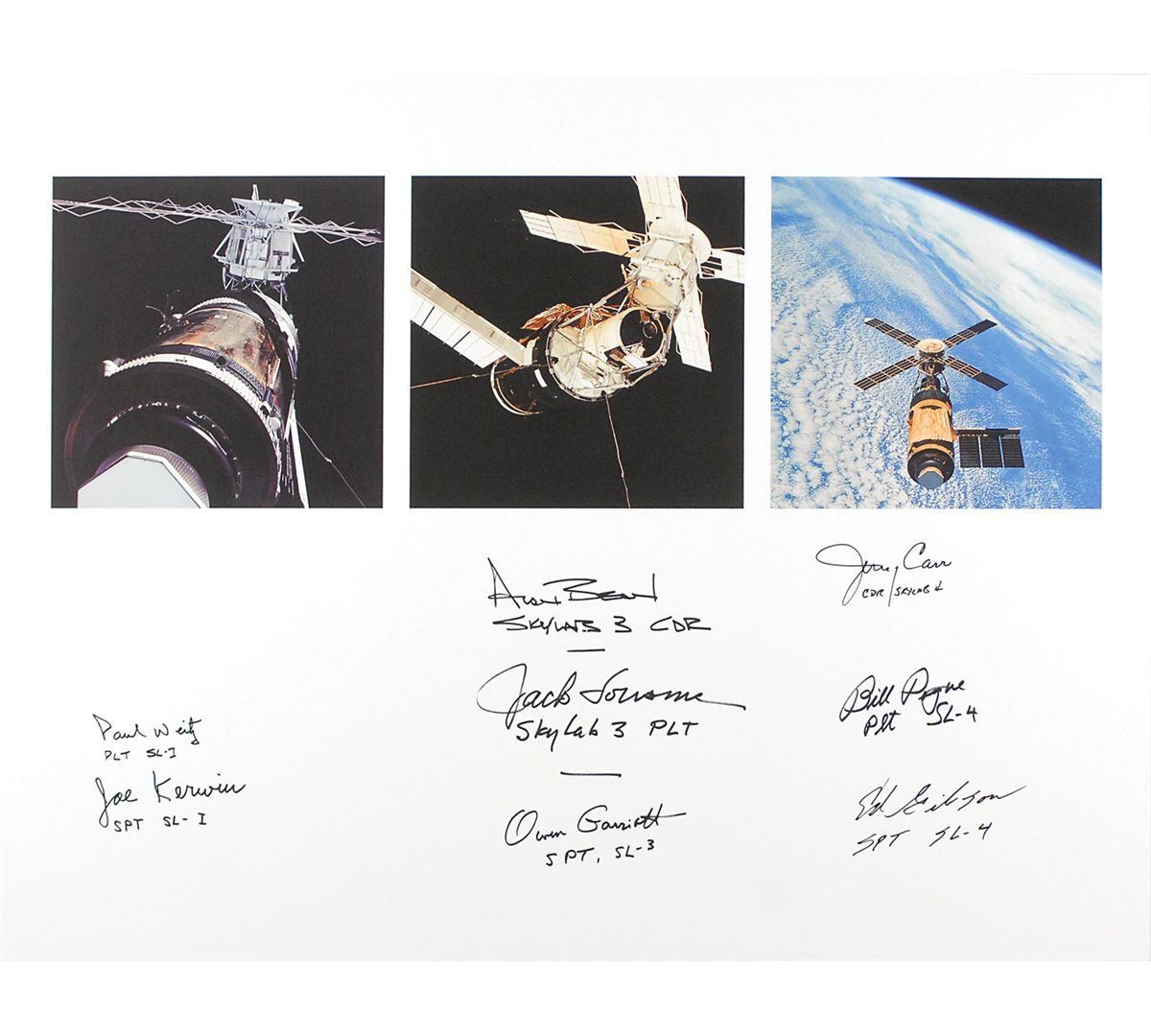 Very nice color print, 22 x 17, with three images of Skylab in orbit, signed in the lower border in black felt tip by Paul Weitz, Joe Kerwin, Alan Bean, Jack Lousma, Owen Garriott, Jerry Carr, Bill Pogue, and Ed Gibson, each adding his flight assignment under his signature. In fine condition.