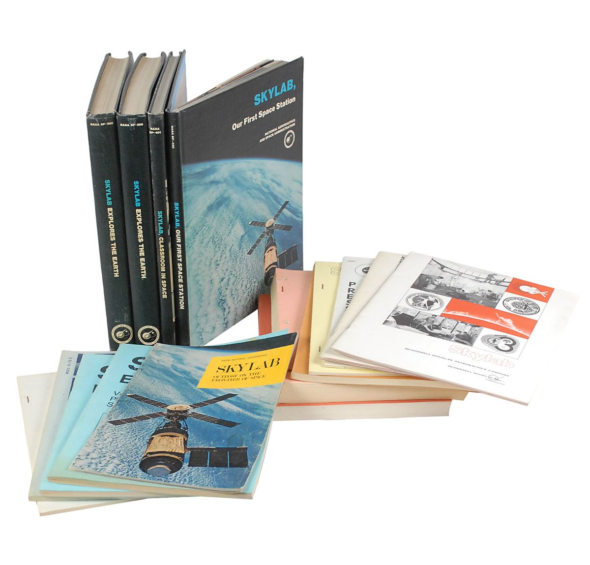 Collection of 16 assorted publications regarding the Skylab project, including: two identical copies of Skylab Explores the Earth, one signed on the title page by Charles Conrad, Alan Bean, and Jerry Carr; five press kits and manuals; two identical McDonnell Douglas manuals; Skylab Experiments, Volumes 1 and 2; and a student project summary issued by the Marshall Space Flight Center. In overall very good condition, with a cracked cover to the signed book.