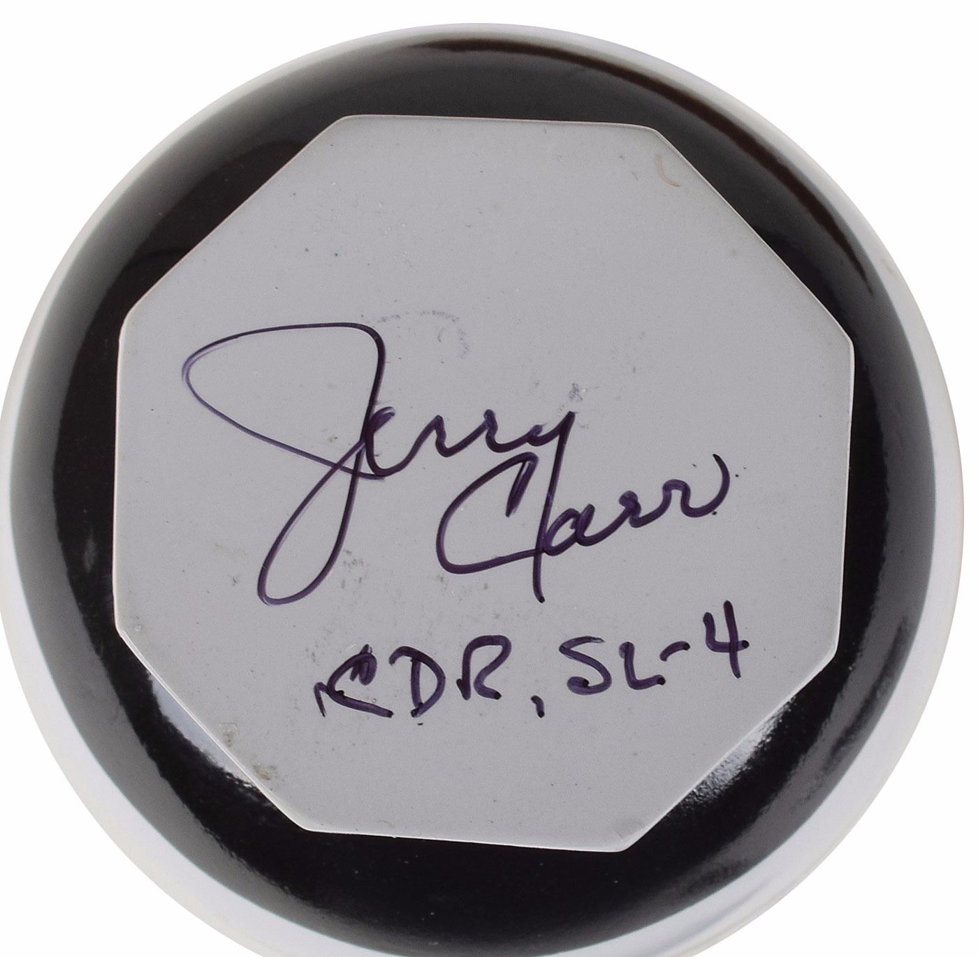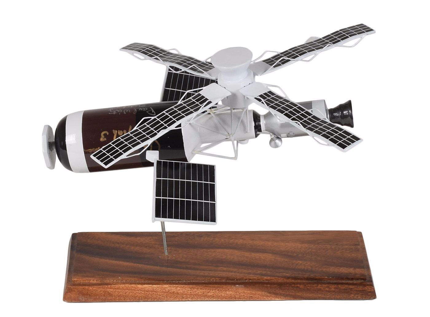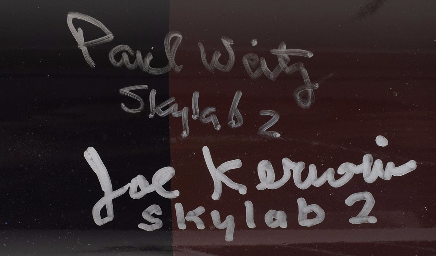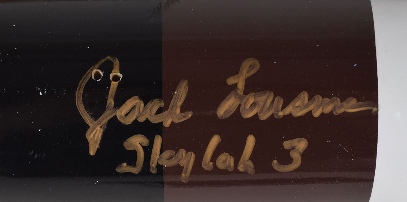 Model of the Skylab space station with removable solar panel arrays, measuring approximately 10.5? long and 2? in diameter, signed on the body in gold ink, "Jack Lousma, Skylab 3," and in silver ink, "Paul Weitz, Skylab 2" and "Joe Kerwin, Skylab 2." Also signed on the front in black felt tip, "Jerry Carr, CDR SL-4." In fine condition.
