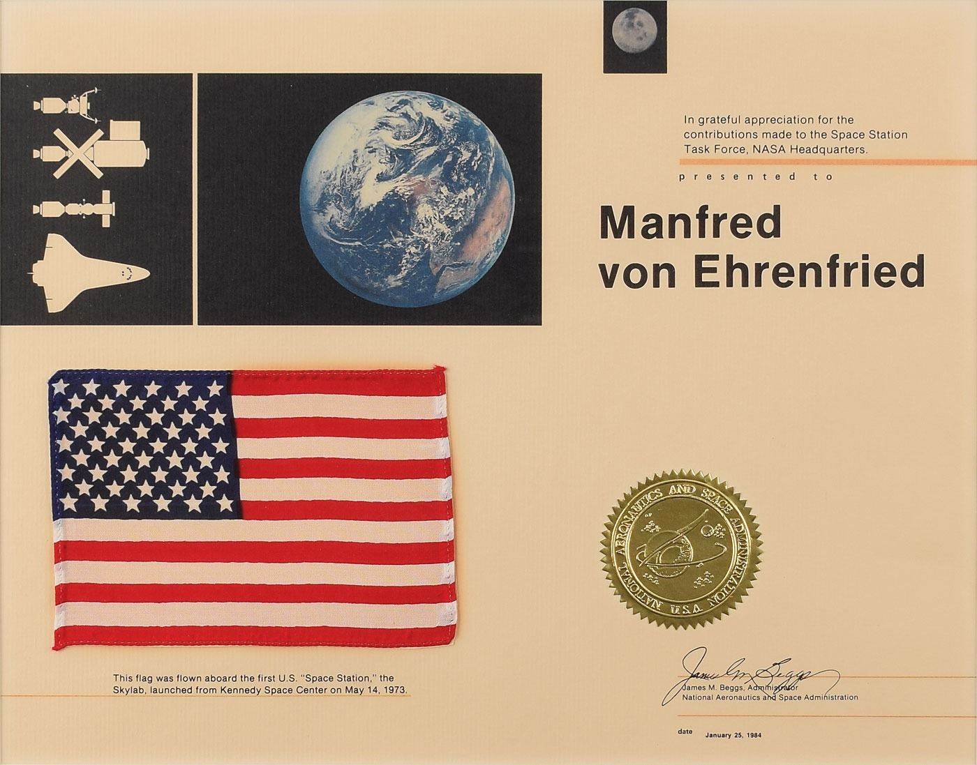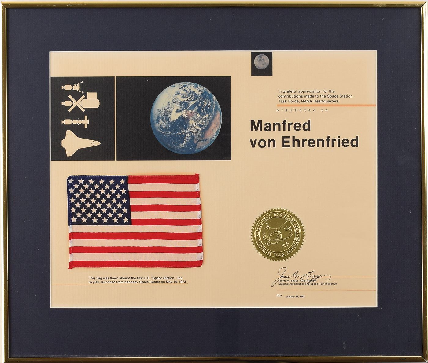 Attractive flown fabric American flag, 5.5 x 4, carried on board the Skylab space station and affixed to its original 13.75 x 10.75 certificate, which reads: "In grateful appreciation for the contributions made to the Space Station Task Force, NASA Headquarters. Presented to Manfred von Ehrenfried." Dated January 25, 1984, the certificate bears an embossed golden NASA seal, a printed signature of James M. Beggs, and a caption below the flag, which reads: "This flag was flown aboard the first U.S. 'Space Station,' the Skylab, launched from Kennedy Space Center on May 14, 1973." Matted and framed to an overall size of 18 x 15.25. In fine condition. Originates from the personal collection of Manfred 'Dutch' von Ehrenfried, a Mercury, Gemini and Apollo Flight Controller, Apollo Pressure Suit Test Subject, NASA hi-altitude aircraft crew member, Mission Staff Engineer and Branch Chief from 1961–1971.