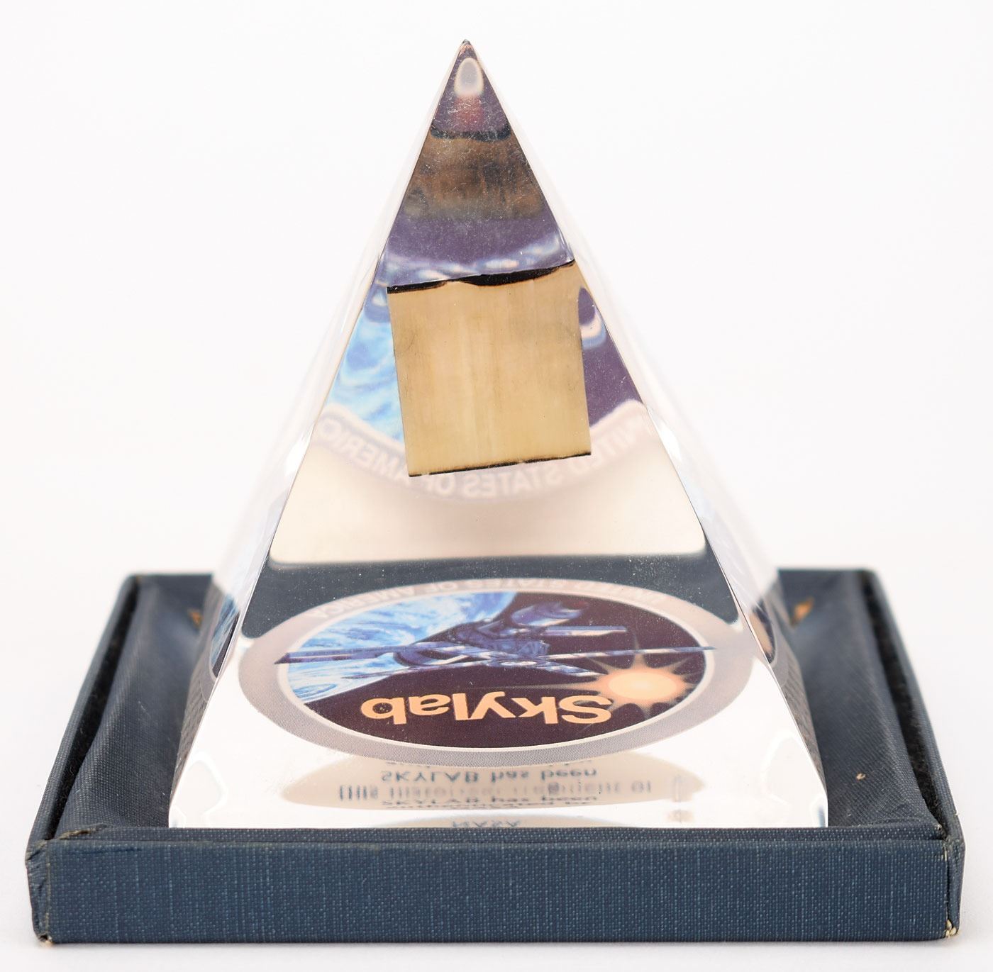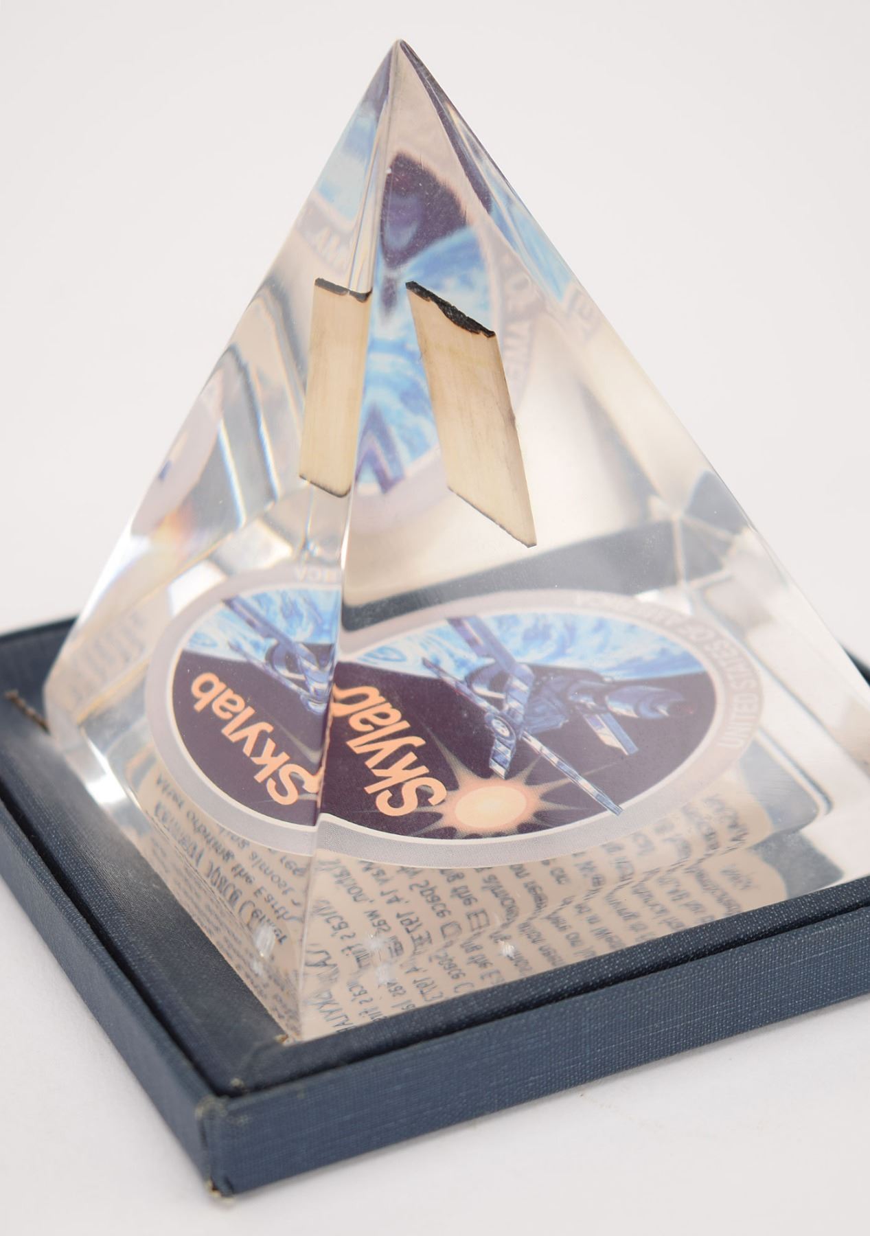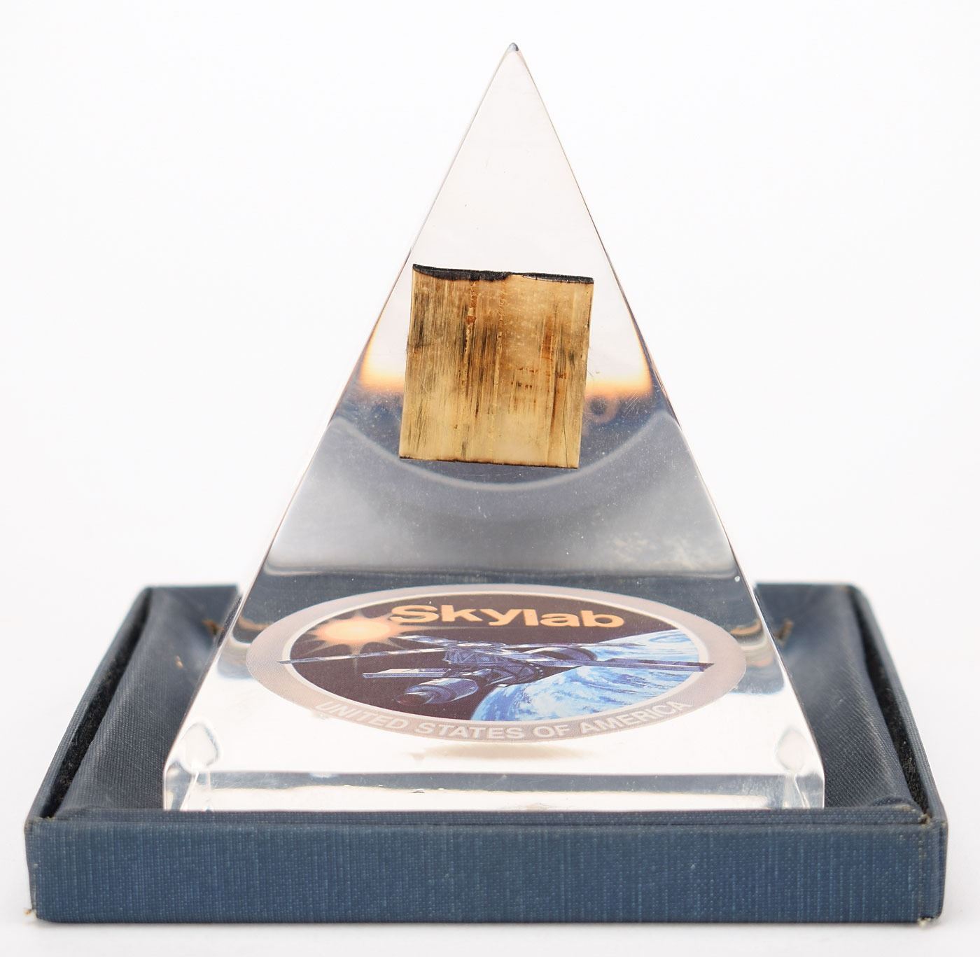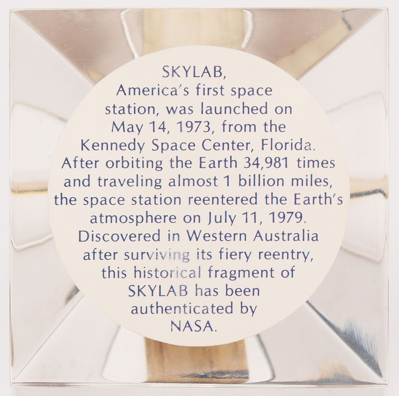 Flown fragment of a Skylab oxygen supply tank recovered in Western Australia after the space station’s fiery reentry in 1979, approximately 1 x 1, encased in a pyramidal 3.25 x 4.5 x 3.25 block of Lucite with a Skylab emblem at the bottom. In fine condition. Accompanied by its original display box and booklet. Originates from the personal collection of Manfred 'Dutch' von Ehrenfried, a Mercury, Gemini and Apollo Flight Controller, Apollo Pressure Suit Test Subject, NASA hi-altitude aircraft crew member, Mission Staff Engineer and Branch Chief from 1961–1971.