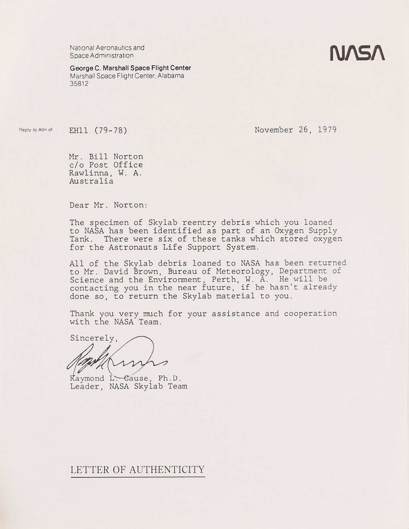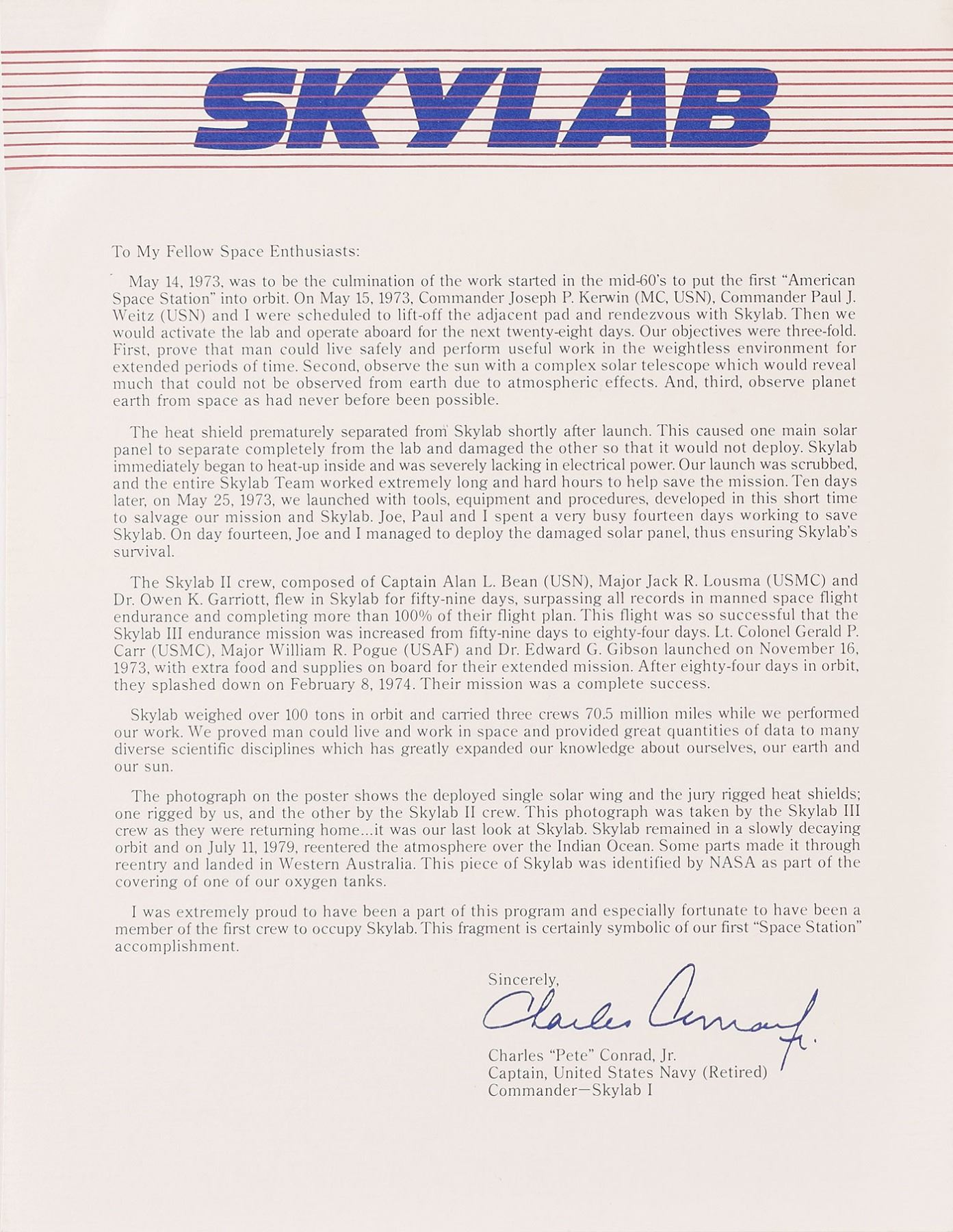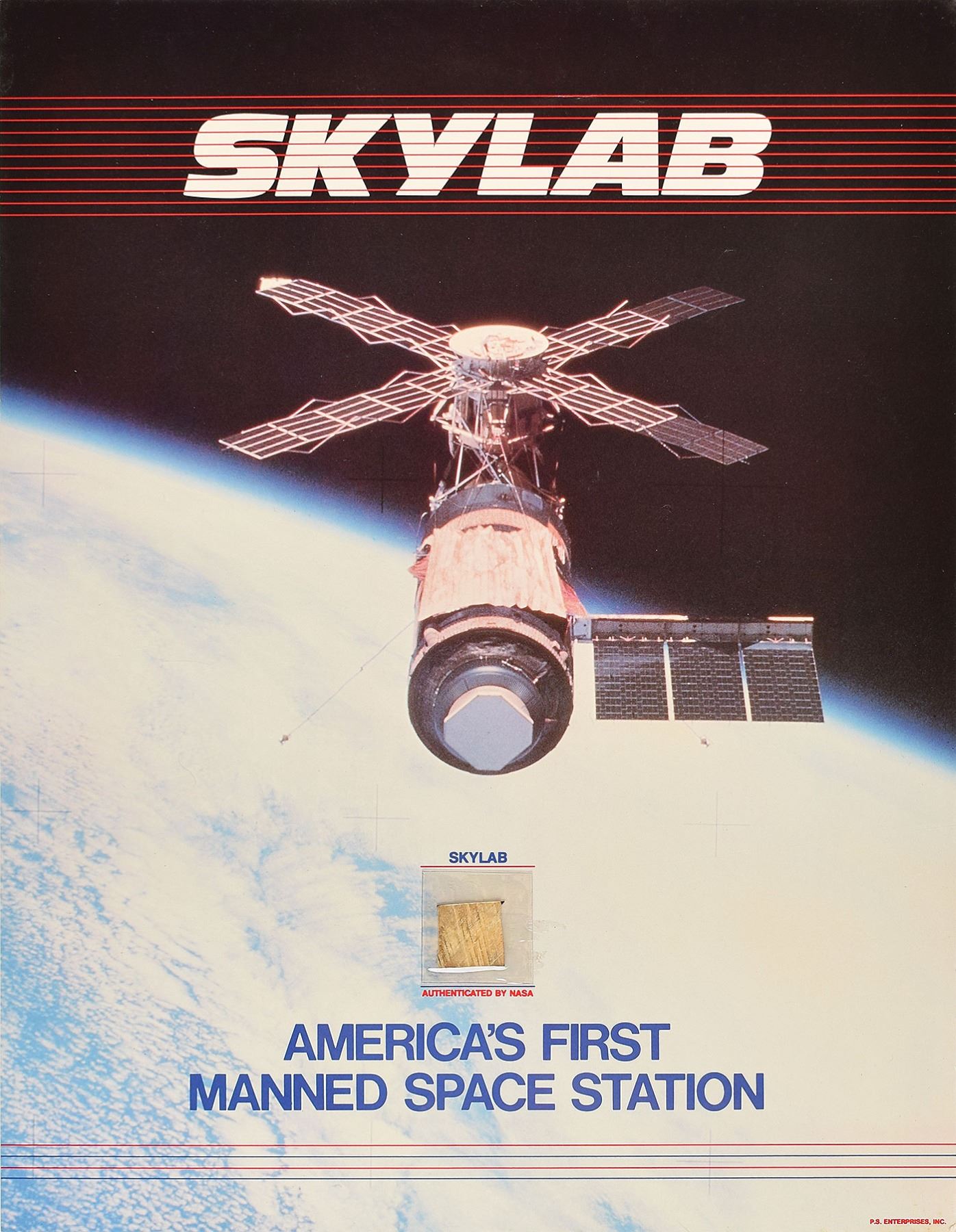 Flown fragment of a Skylab oxygen supply tank recovered in Western Australia after the space station’s fiery reentry in 1979, approximately 1 x 1, displayed inside a plastic sleeve affixed to a color 17 x 22 poster. In fine condition. Accompanied by two copies of letters with facsimile signatures, certifying the fragment.