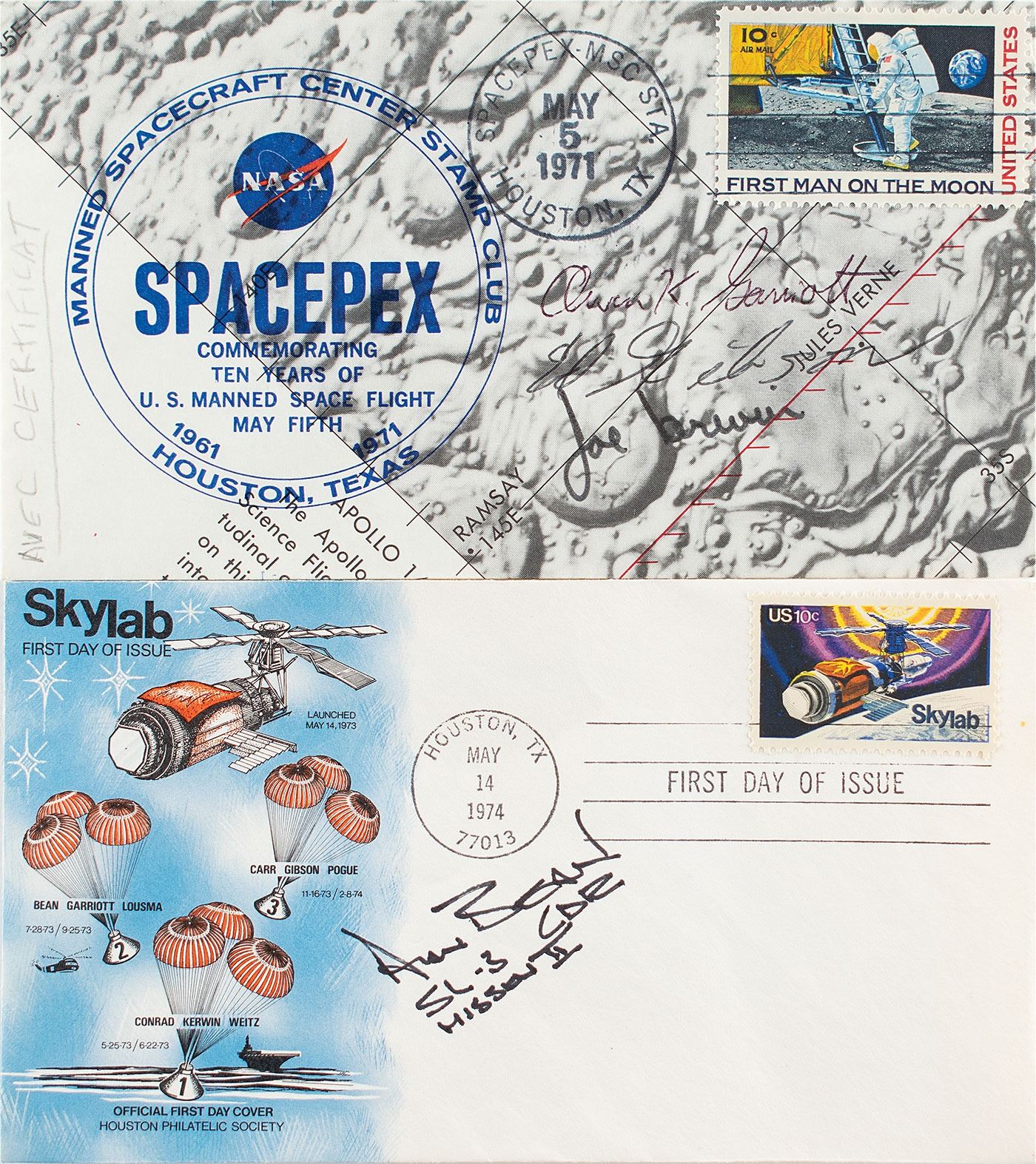 Two covers: an FDC with a color cachet honoring the Skylab program, postmarked on May 14, 1974, signed in black felt tip, "Alan Bean, SL-3, CDR, Mission II"; and an uncommon 'Apollo Chart' style cover with "Spacepex" cachet commemorating 10 years of U.S. manned space flight, postmarked on May 5, 1971, signed by all three of the Science Pilots from the Skylab missions: in black ballpoint, "Owen K. Garriott" and "Ed Gibson," and in black felt tip, "Joe Kerwin." In overall fine condition.