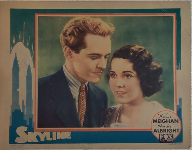 Skyline (Fox Pictures, 1931) lobby card. Drama. Starring Thomas Meighan, Hardie Albright, Maureen O'Sullivan, Stanley Fields, Robert McWade. Directed by Sam Taylor. Some edge wear, creases, tear, tape, stains, fading. Fair. (11"x14").