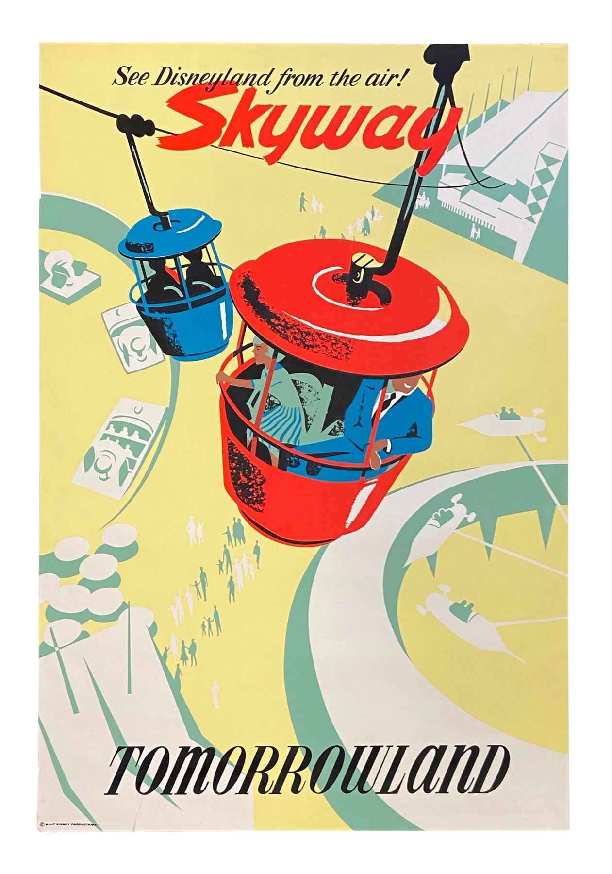 (Disneyland, 1956) A hand-silkscreened poster for the Skyway attraction. Designed by Bjorn Aronson, this poster features the Skyway overlooking several early Tomorrowland landmarks. Measuring 54"x36", the poster is in good condition with a slight trim to the top 10" of the left edge from previous framing, some creasing to the right-edge, and wear to the bottom-left corner, including a thin 3" tear below the first "O" in Tomorrowland. The poster was previously adhered to a board backing but has been professionally removed.