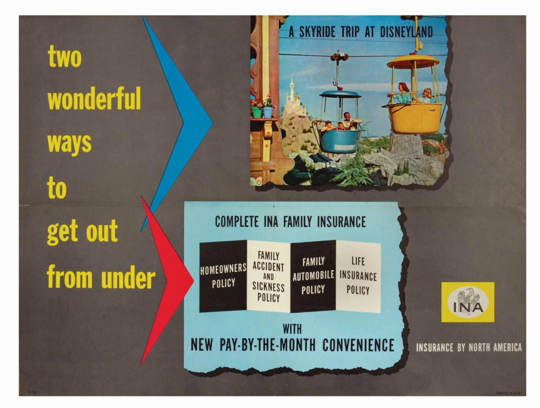 (Disneyland, 1958) An original promotional poster for Disneyland created by INA. The poster features beautiful imagery of the original Skyway, and discusses INA options for family insurance. Measuring 18"x24", this rare poster is in very good condition with minor wear to the original fold lines.