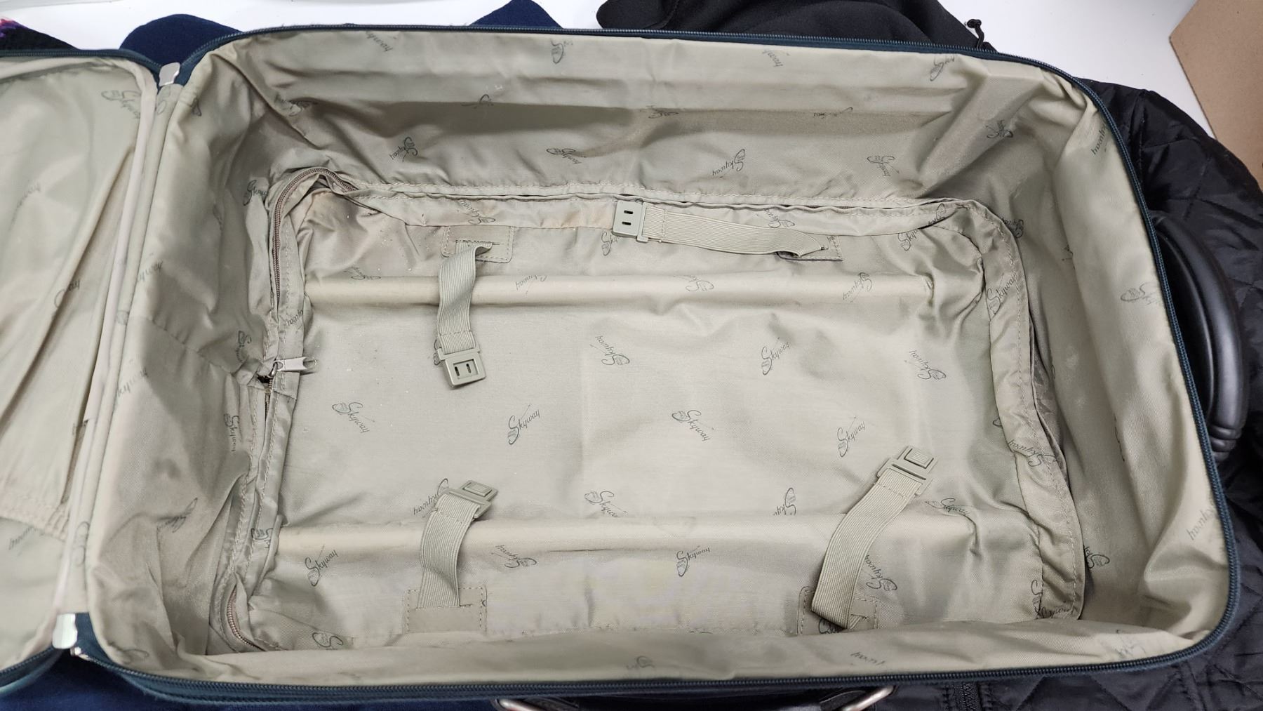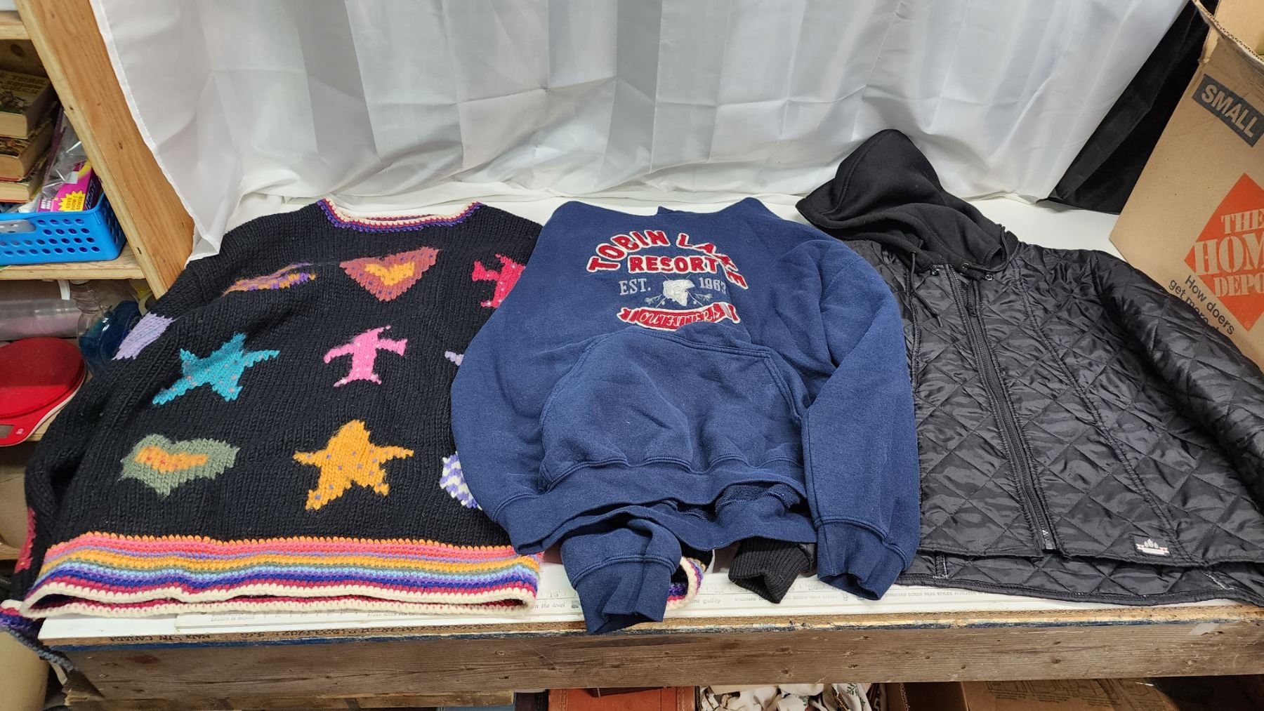 Skyway suit case, with 3 assorted jacket and sweaters - Black is sz L, Blue is sz XL, and last is La